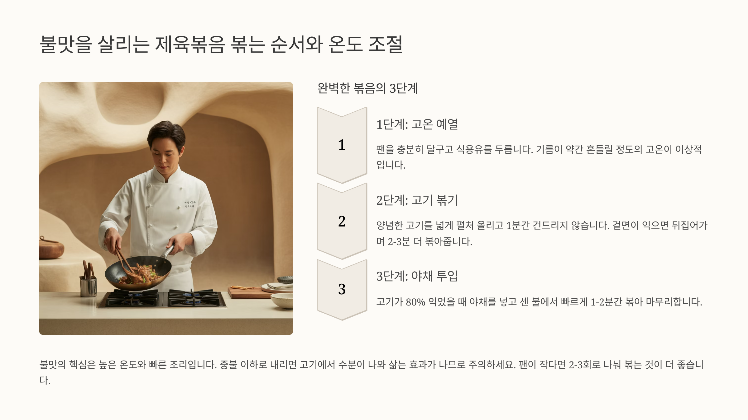 제육볶음의 완성은 양념이 아닌 **'볶는 기술'**에서 결정됩니다. 맛집 제육볶음의 핵심인 **불맛(Wok Hei)**을 내기 위해서는 **최대한 센 불(강불)**에서 빠르게 볶는 것이 필수입니다. 볶는 순서는 고기, 단단한 채소(양파, 당근), 양념, 부드러운 채소(대파, 깻잎) 순서가 가장 이상적입니다. 특히, **고기를 먼저 센 불에 볶아 마이야르 반응**을 일으켜야 고기 표면에 풍미가 응축됩니다. 고기가 약 70~80% 익었을 때 양파와 같은 단단한 채소를 넣고, 마지막에 양념을 추가하여 재빨리 볶아줍니다. 이때, 물을 넣지 않고 **채소에서 나오는 수분과 양념만으로** 볶아야 양념이 희석되지 않고 농축된 맛을 유지할 수 있습니다. **'태우듯이 볶는다'**는 느낌으로 짧은 시간 안에 조리를 마무리하는 것이 전문가의 비결입니다.