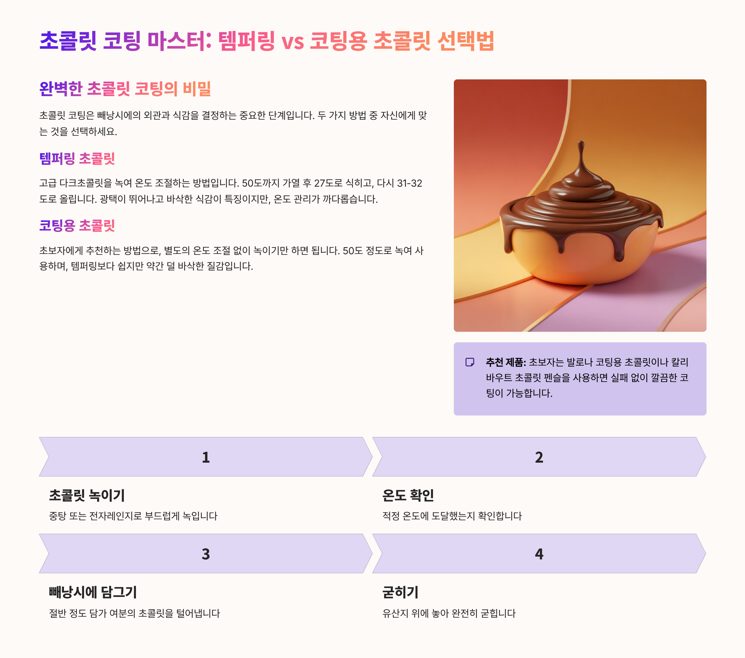 ⚠️ 주의하세요! 코팅 실패 방지 팁 초콜릿에 **수분**이 단 1g이라도 들어가면 전체가 뻑뻑하게 굳어버리는 '분리 현상'이 발생합니다. 중탕 시 김이 들어가지 않도록 주의하고, 휘낭시에 자체가 완전히 식었는지 확인 후 코팅해야 합니다.