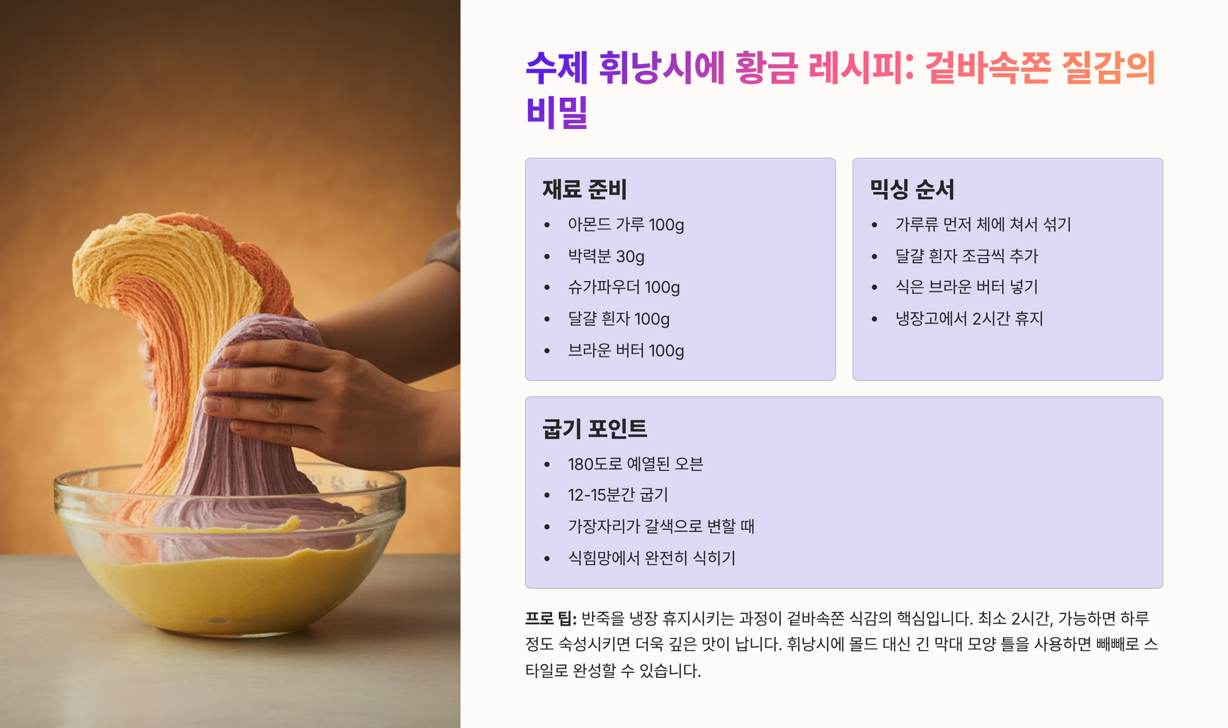 **푸터:** 오븐 사양에 따라 편차가 크므로, 반드시 구움색을 확인하며 시간을 조절해야 합니다.