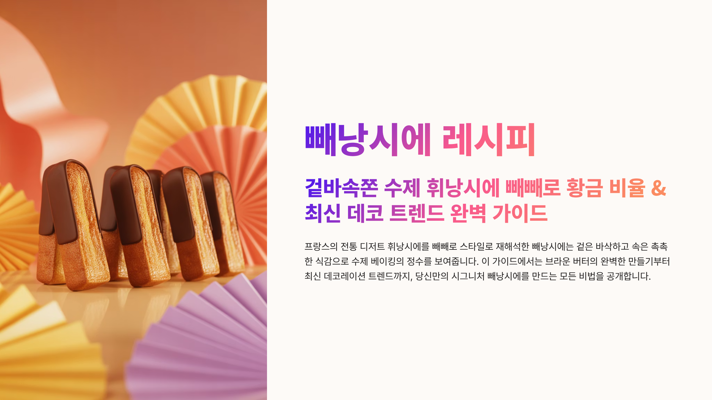 💡 인트로: 매년 돌아오는 기념일, 특별한 마음을 전하고 싶다면 '빼낭시에'에 주목해 보세요. 겉은 바삭하고 속은 쫀득한 프랑스 구움 과자 휘낭시에를 길쭉한 빼빼로 모양으로 만들어 초콜릿을 입힌 이 디저트는 단순한 막대 과자 이상의 고급스러움과 정성을 담고 있습니다. 본 가이드는 단순한 레시피 나열을 넘어, 브라운 버터 제조부터 최신 데코 트렌드, 그리고 실패를 줄이는 과학적인 팁까지, 누구나 전문가 수준의 수제 휘낭시에 빼빼로를 만들 수 있도록 심층적인 정보를 제공합니다. 지금부터 구글 검색 상위 노출을 목표로 하는 전문적인 베이킹 지식을 함께 탐험해 봅시다.