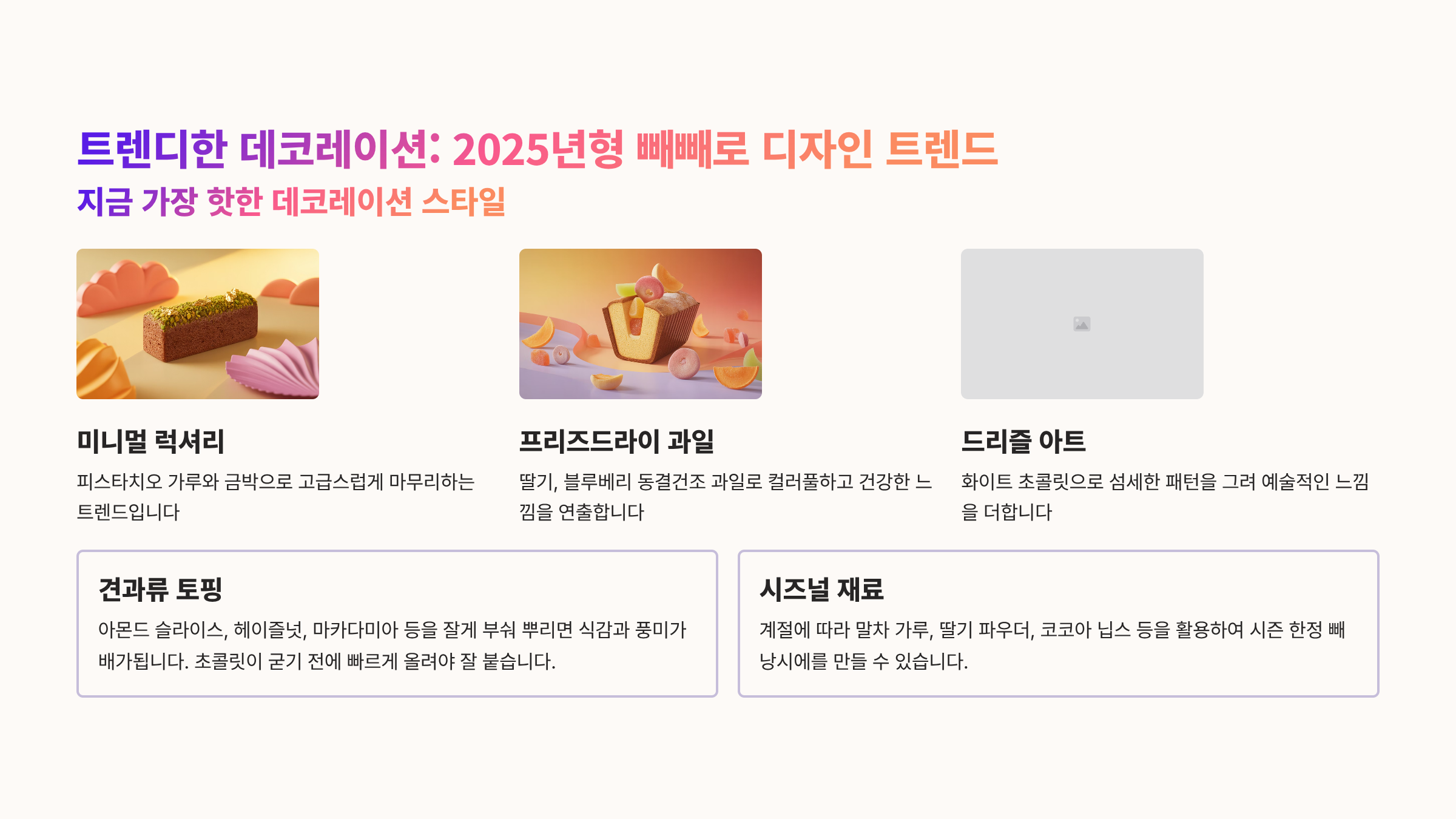 2025년 수제 빼빼로 트렌드는 단순한 토핑을 넘어선 **'개인화'와 '미니멀리즘'**으로 요약될 수 있습니다. 길쭉한 휘낭시에 빼빼로 위에 크런치, 스프링클을 묻히는 전통적인 방식은 여전히 인기지만, 최근에는 솔티드 카라멜, 피스타치오, 쑥 크럼블, 약과 등 한국적인 재료나 고급 디저트 재료를 활용한 독특한 풍미의 코팅이 주목받고 있습니다. 데코레이션의 핵심은 '여백의 미'입니다. 휘낭시에 전체를 코팅하기보다는, 3분의 2 또는 끝부분만 코팅하고 남은 부분은 휘낭시에 본연의 황금빛 색상을 강조하는 미니멀한 디자인이 세련미를 더합니다. 또한, 식용 펄이나 금가루를 활용하여 금괴 모양의 휘낭시에를 더욱 강조하는 '골드 라인' 데코도 큰 인기를 얻고 있습니다.