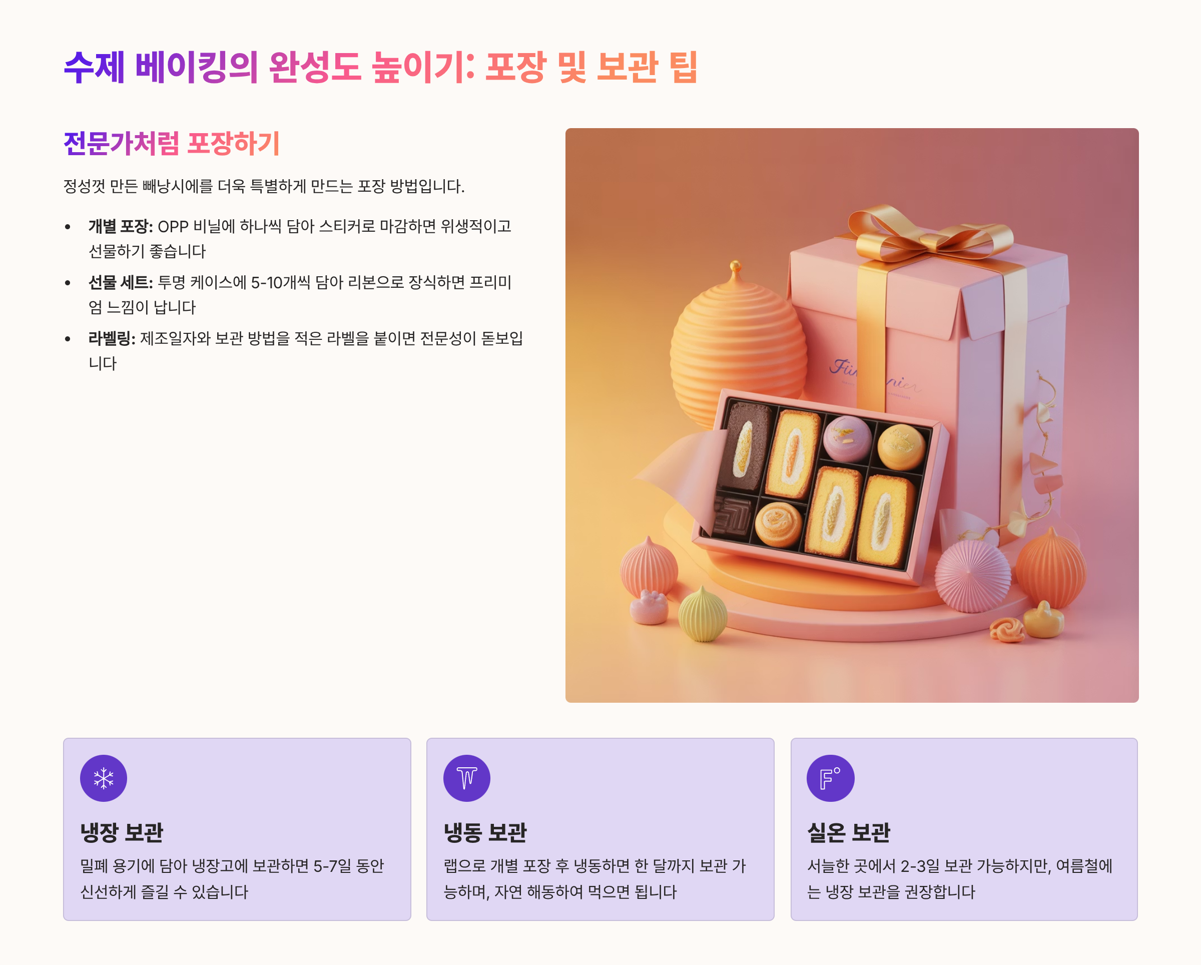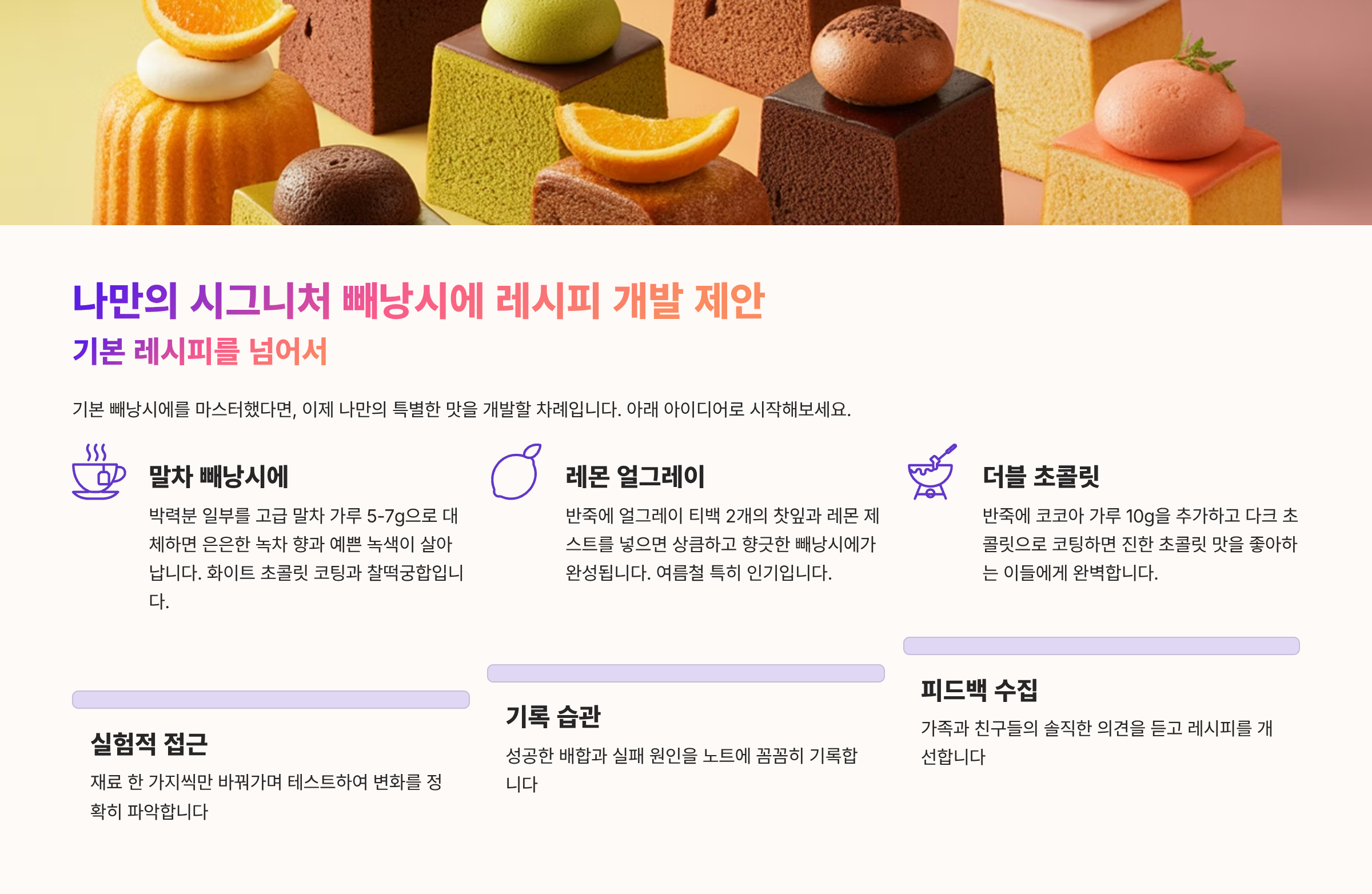 **푸터:** 데코레이션은 과유불급. 하나의 메인 토핑에 집중하여 휘낭시에 본연의 맛을 해치지 않도록 해야 합니다.