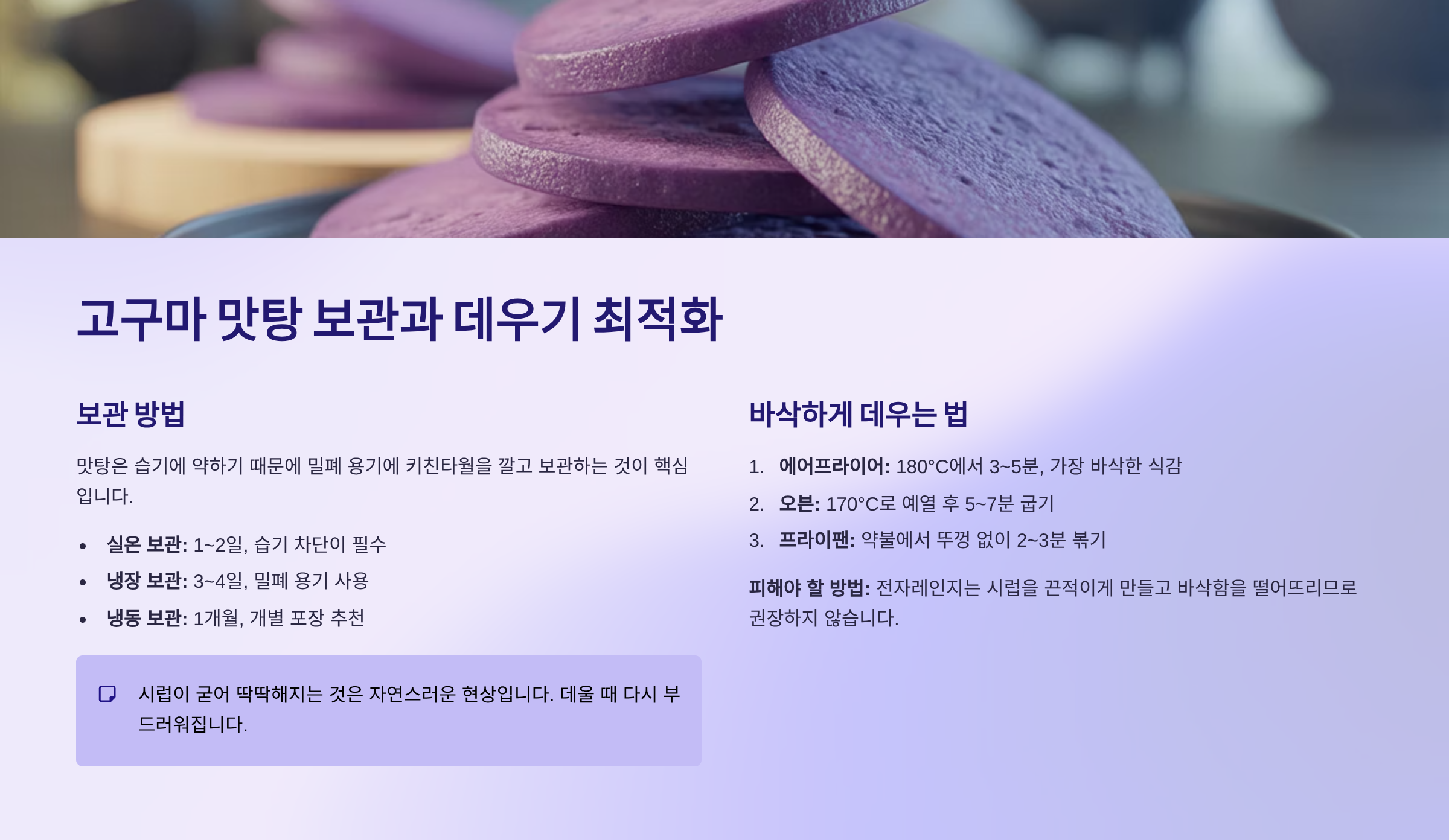 A: 👉 전자레인지는 내부 수분을 증가시켜 시럽을 녹이고 고구마를 **눅눅하게** 만들 뿐, 바삭함을 되살릴 수 없습니다.