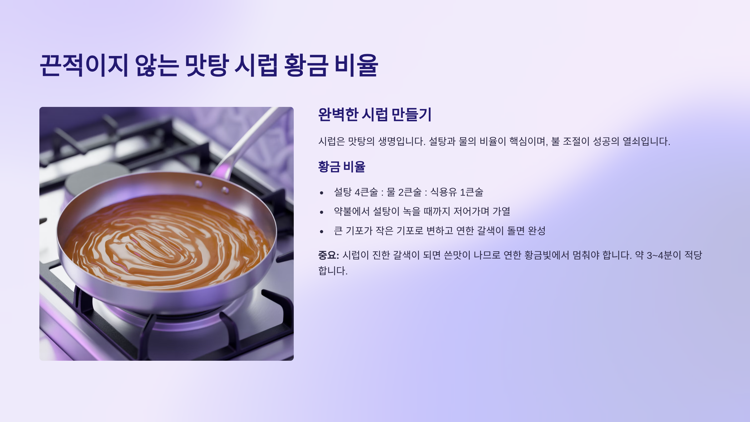맛탕 시럽이 실패하는 가장 큰 이유는 설탕과 물의 **황금 비율**을 맞추지 못하거나, 조리 과정에서 불 조절을 잘못하여 설탕을 태우는 경우입니다. 완벽한 시럽의 황금 비율은 **설탕 : 물 : 식용유를 $2:1:1$**로 하는 것입니다. 이 비율은 설탕의 결정화를 돕고, 식용유가 코팅 역할을 하여 맛탕의 끈적임을 방지하고 윤기를 더해줍니다. 시럽을 만들 때는 설탕과 물을 팬에 넣고 젓지 않고 강불에서 끓이는 것이 핵심입니다. 젓게 되면 설탕이 재결정화되어 시럽이 굳지 않거나 하얗게 변하는 현상이 발생할 수 있습니다. 시럽이 가장자리부터 연한 갈색으로 변하기 시작하면 불을 약하게 줄이고, 이때 튀겨둔 고구마를 넣고 빠르게 버무려줍니다. 시럽의 완벽한 상태는 '카라멜화'가 진행되기 직전의 농도로, 약 $150\text{°C} \sim 160\text{°C}$에 도달했을 때입니다. 만약 시럽을 너무 오래 끓여 진한 갈색으로 변했다면 탄 맛이 날 수 있으니 즉시 새 시럽을 만드는 것이 좋습니다. 마지막으로 시럽을 버무릴 때 깨나 견과류를 함께 넣어주면 맛과 영양, 시각적인 효과를 동시에 높일 수 있습니다.