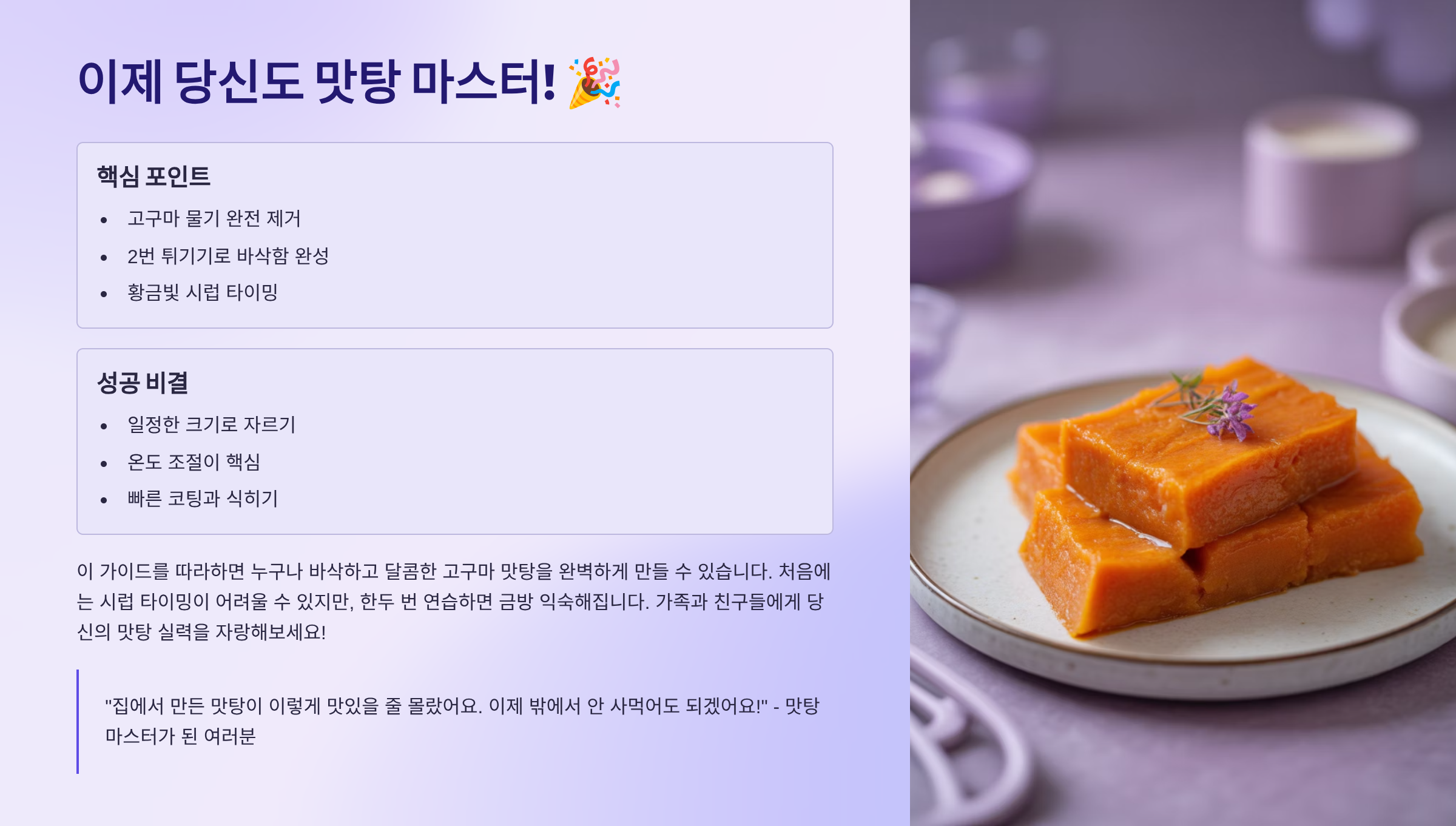 지금까지 실패 없이 **고구마 맛탕**을 만들 수 있는 모든 비법을 알려드렸습니다. 오늘 제시된 황금 비율과 2단계 튀기기 노하우를 활용하여 최고 품질의 겉바속촉 맛탕을 성공적으로 만들어 보시길 바랍니다. 맛탕 조리 과정에서 추가적인 궁금증이 생기셨다면 언제든지 댓글로 물어봐주세요~ 😊