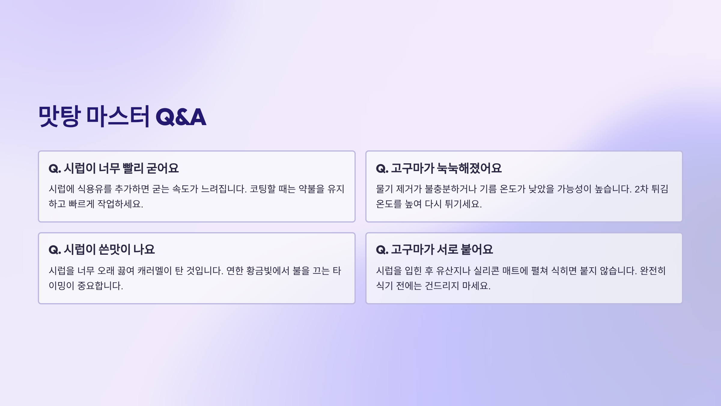A: 👉 시럽이 굳기 전에 **10~15초 이내**로 재빨리 버무려야 하며, 시럽이 너무 뜨거울 때 버무리면 고구마가 눅눅해질 수 있습니다.