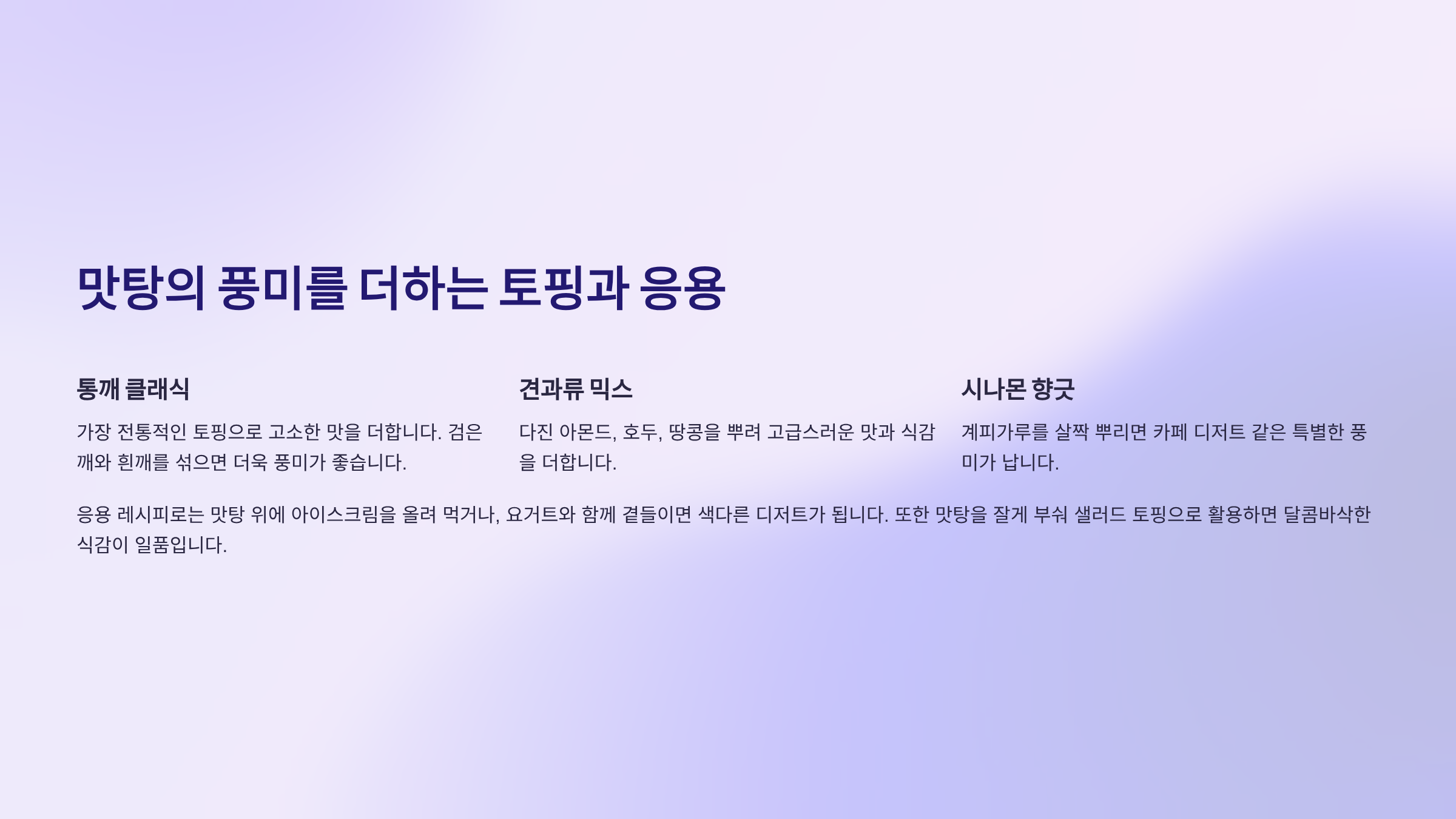 기본적인 **고구마 맛탕** 레시피에 익숙해졌다면, 이제는 다양한 토핑과 응용 레시피를 통해 맛의 스펙트럼을 넓혀볼 차례입니다. 가장 클래식한 토핑은 볶은 검은깨와 통깨입니다. 깨는 시럽의 단맛을 중화시키고 고소함을 더해주어 맛탕의 풍미를 한층 끌어올려 줍니다. 좀 더 고급스러운 맛을 원한다면, 잘게 부순 호두, 아몬드, 피칸 등의 **견과류**를 시럽에 버무리는 단계에 함께 넣어 보세요. 견과류의 오독오독한 식감과 고소함이 맛탕의 부드러움과 환상적인 조화를 이룹니다. 응용 레시피로는 **'카레 맛탕'**이나 **'치즈 맛탕'**이 최근 인기를 얻고 있습니다. 카레 맛탕은 고구마 튀김 시 아주 소량의 카레 가루를 묻혀 튀겨내면 은은한 카레 향이 단맛을 잡아주어 더욱 이색적인 맛을 선사합니다. 치즈 맛탕은 시럽을 입힌 후 파마산 치즈 가루를 뿌려주거나, 모짜렐라 치즈를 올려 살짝 녹여 먹는 방식으로, 젊은 층에게 특히 선호도가 높습니다. 이처럼 작은 변화만으로도 고구마 맛탕은 무궁무진하게 변신할 수 있는 잠재력을 가지고 있습니다.