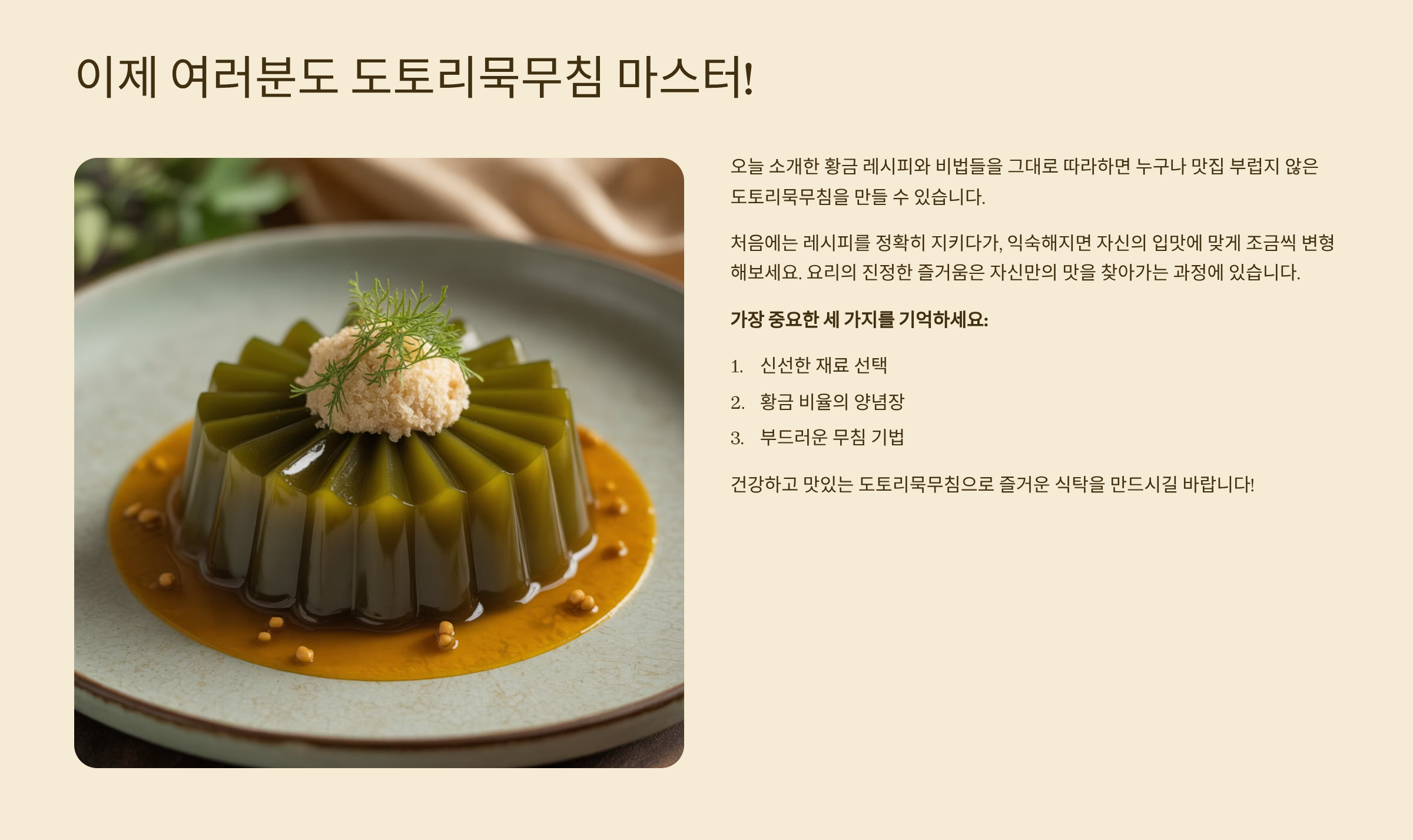 이 글에서 제시한 감칠맛 도토리묵무침 양념장 황금 레시피와 특급 노하우를 통해, 여러분의 식탁에 건강과 맛을 더하는 명품 도토리묵무침을 완성하시길 바랍니다. 이 레시피는 단순한 요리법을 넘어, 도토리묵이 가진 본연의 건강함을 최대한 살리고, 한국적인 맛의 깊이를 더하는 과학적인 접근입니다. 더 궁금한 점이 있다면 댓글로 물어봐주세요~ 😊
