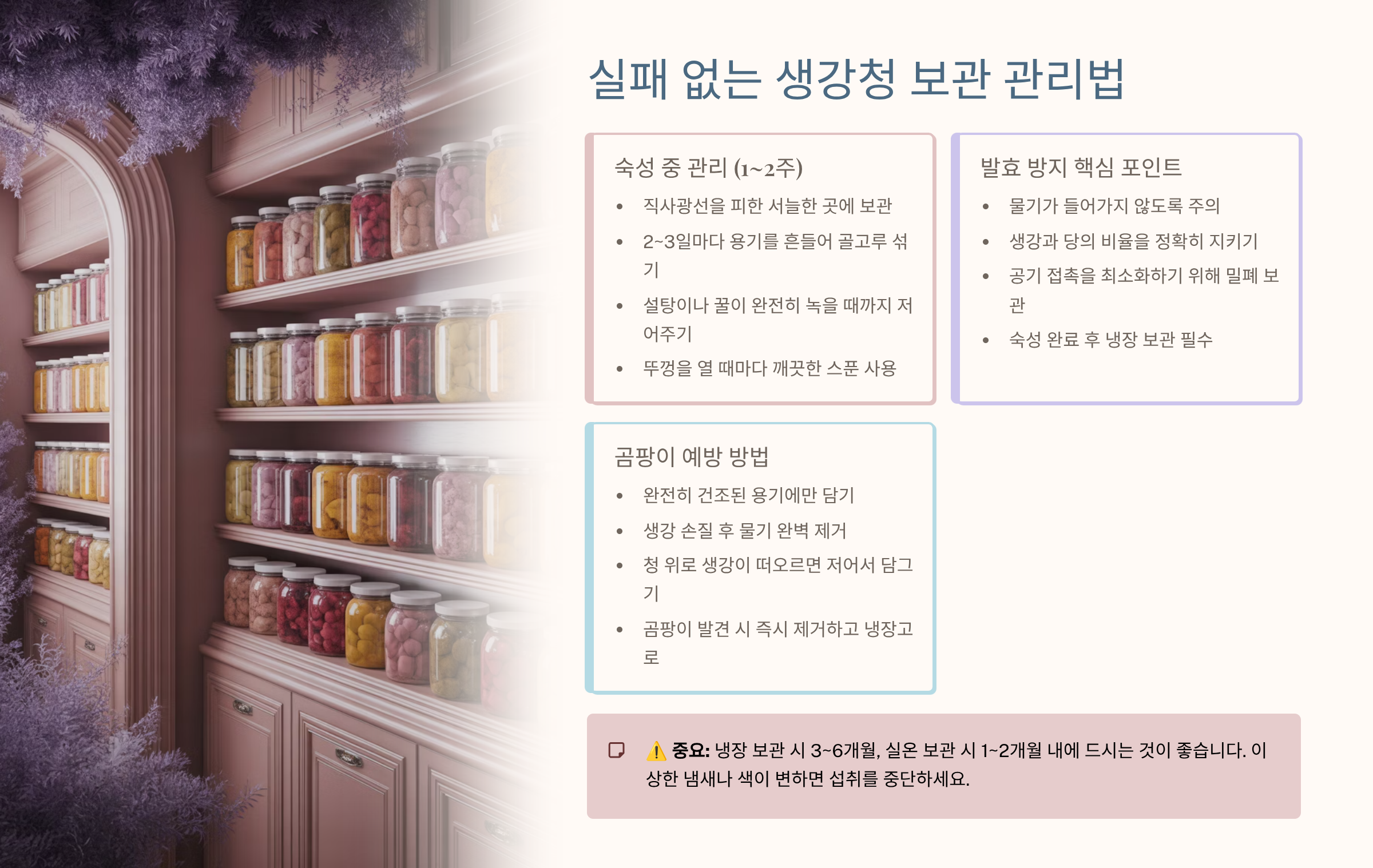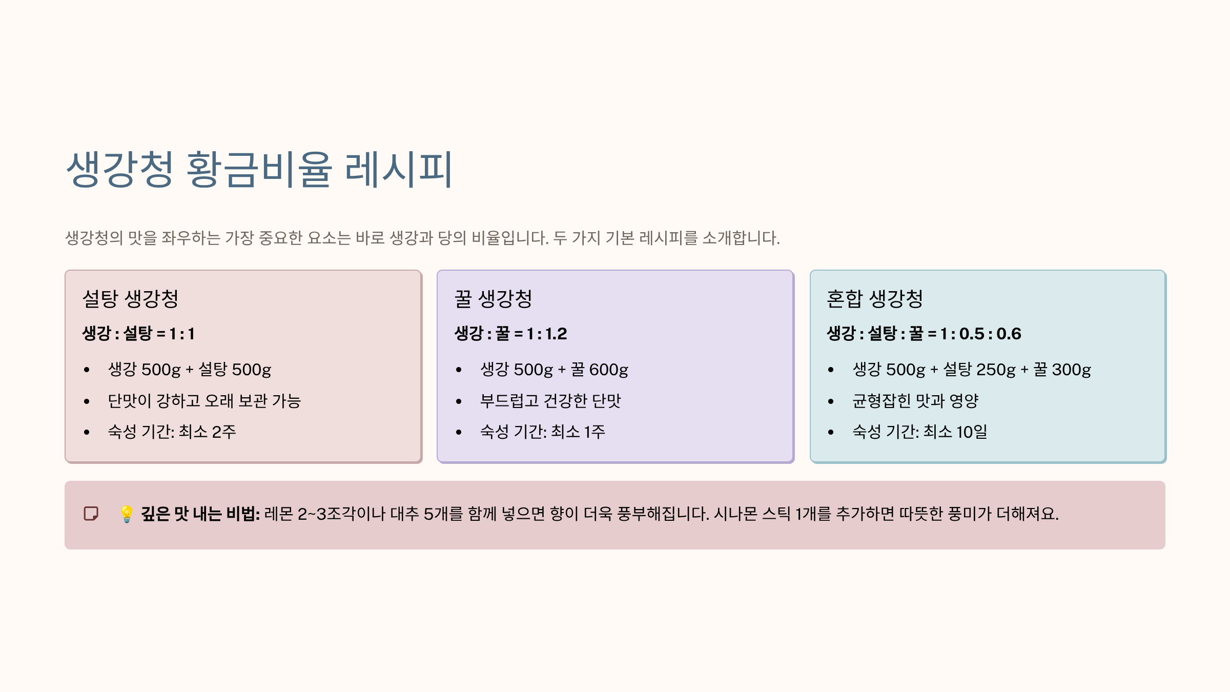 핵심 강조 2 (비율/위생): 생강:당분 1:1.2 비율을 기본으로, 용기는 반드시 열탕 소독 후 완벽 건조해야 합니다.