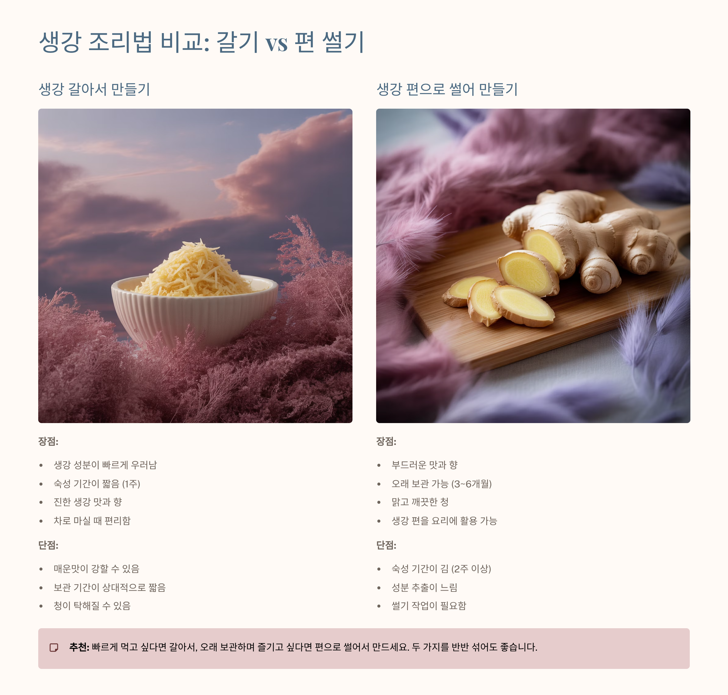 4. 생강을 갈아서 청 만들기 vs 편 썰기, 각각의 장단점 비교 분석 📊