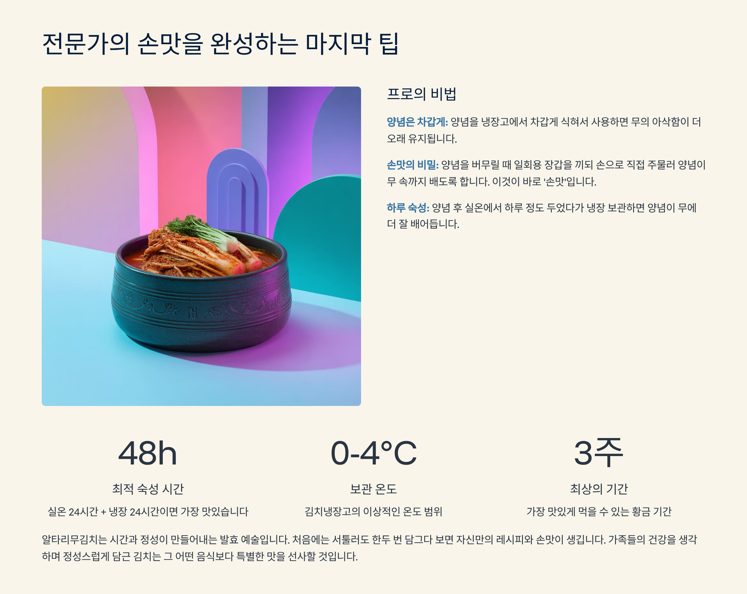 지금까지 **알타리무김치**를 **쉽게 담그고** 오랫동안 맛있게 즐길 수 있는 **전문적이고 과학적인 가이드**를 살펴보았습니다. 김치를 담그는 것은 단순히 재료를 섞는 행위가 아니라, 무의 신선도를 판단하고, 염도와 숙성 온도를 정밀하게 제어하는 **하나의 정교한 공정**입니다. 특히 **절임 과정과 양념의 황금 비율**은 알타리무김치 맛의 성패를 가르는 핵심임을 기억해야 합니다. 초보자라도 이 가이드에 제시된 **최신 트렌드 레시피와 과학적 팁**을 따른다면, 실패 없이 아삭하고 시원한 알타리무김치를 완성할 수 있습니다. 가족의 식탁을 풍요롭게 할 이 맛있는 알타리무김치는 정성이 들어간 만큼 더욱 특별한 의미를 가집니다. 오늘 제시된 전문 지식을 바탕으로 여러분만의 **최고의 알타리무김치**를 완성하시길 바랍니다.