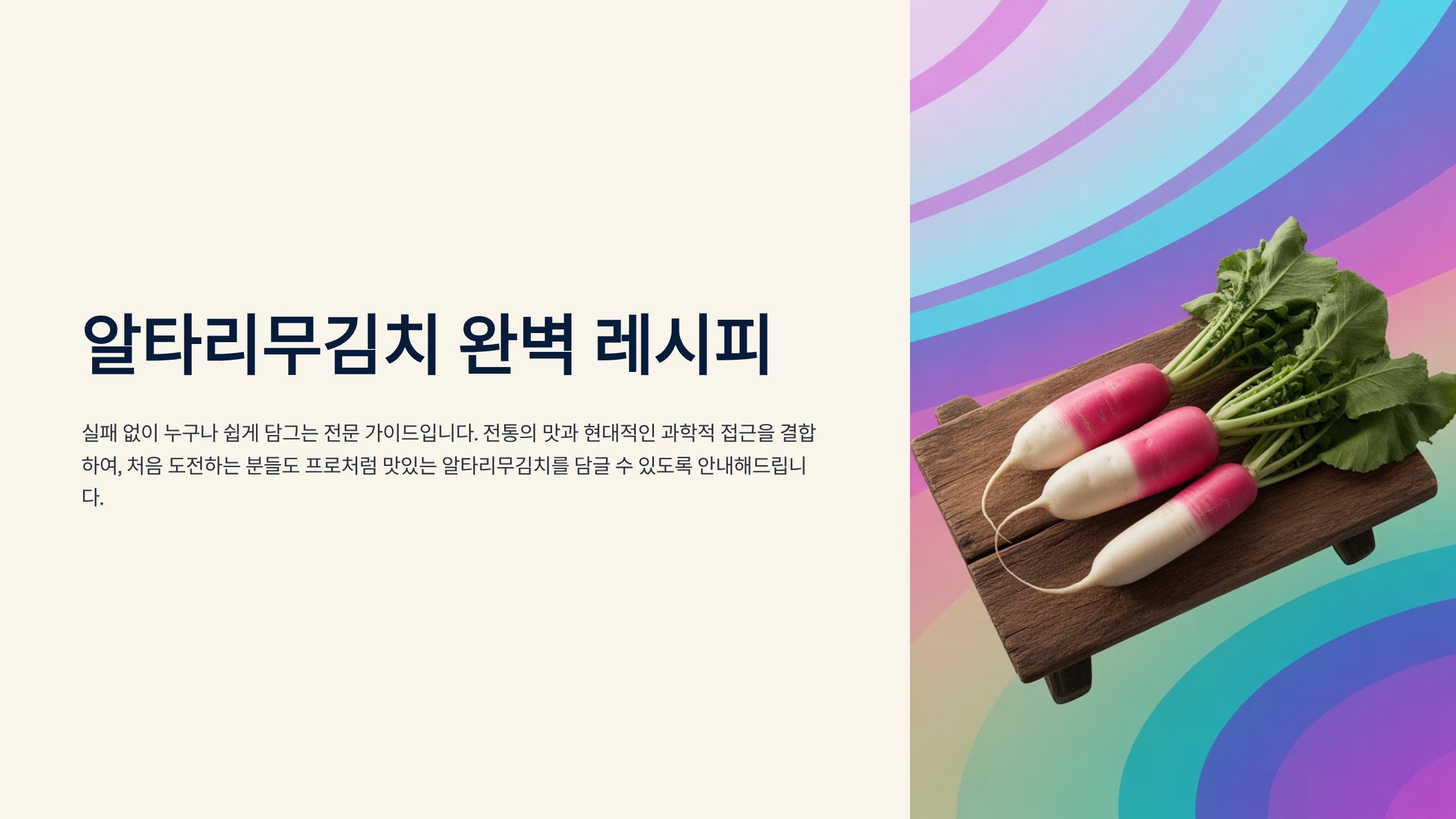 찬바람이 불기 시작하면 생각나는 별미, 바로 **알타리무김치**입니다. 아삭한 무와 시원한 무청의 조화는 한국인의 밥상에서 빼놓을 수 없는 핵심 반찬이죠. 하지만 무를 절이는 과정부터 양념 비율까지, 성공적인 알타리무김치를 담그는 것은 생각보다 까다로울 수 있습니다. 이 가이드는 **2025년 최신 김치 트렌드**와 과학적인 발효 원리를 접목하여, 김치 초보자도 쉽게 따라 할 수 있는 **전문적이고 완벽한 레시피**를 제공합니다. 구글 검색 엔진 최적화(SEO) 기준에 맞춰, 신뢰도 높은 최신 정보를 바탕으로 구성된 이 글을 통해 여러분도 오늘부터 **알타리무김치 명인**이 될 수 있습니다. 무의 상태 점검부터 황금 양념장 비법까지, 지금부터 그 모든 것을 자세히 파헤쳐 보겠습니다.