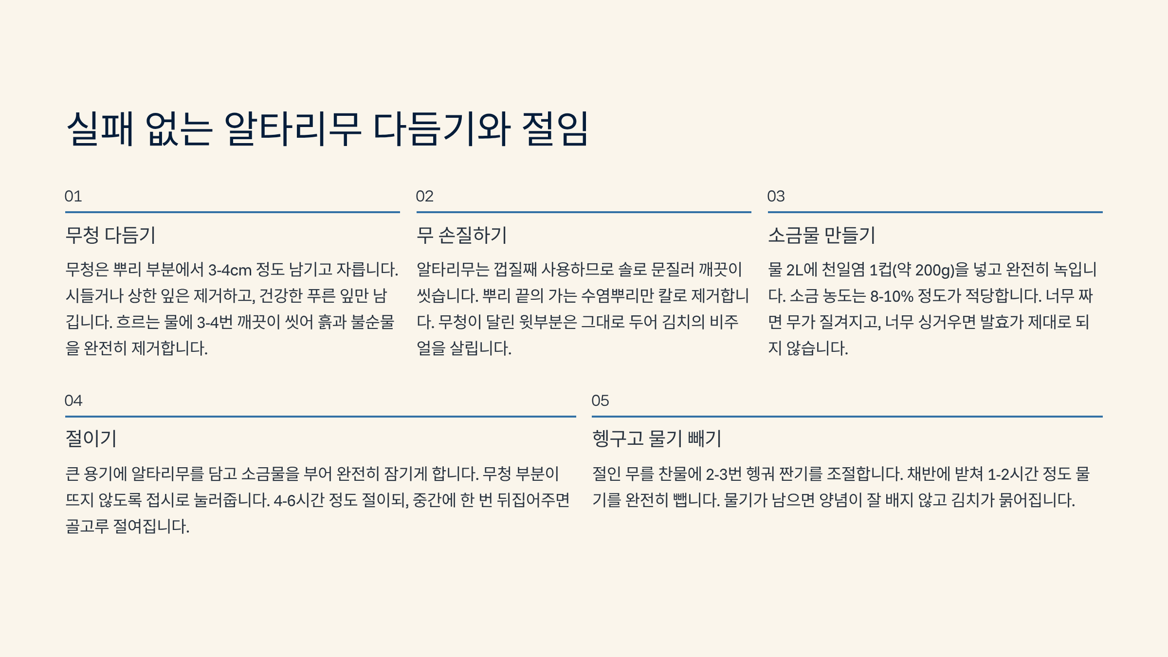 2. 실패 없는 알타리무 다듬기와 최적의 절임 시간 분석 📝