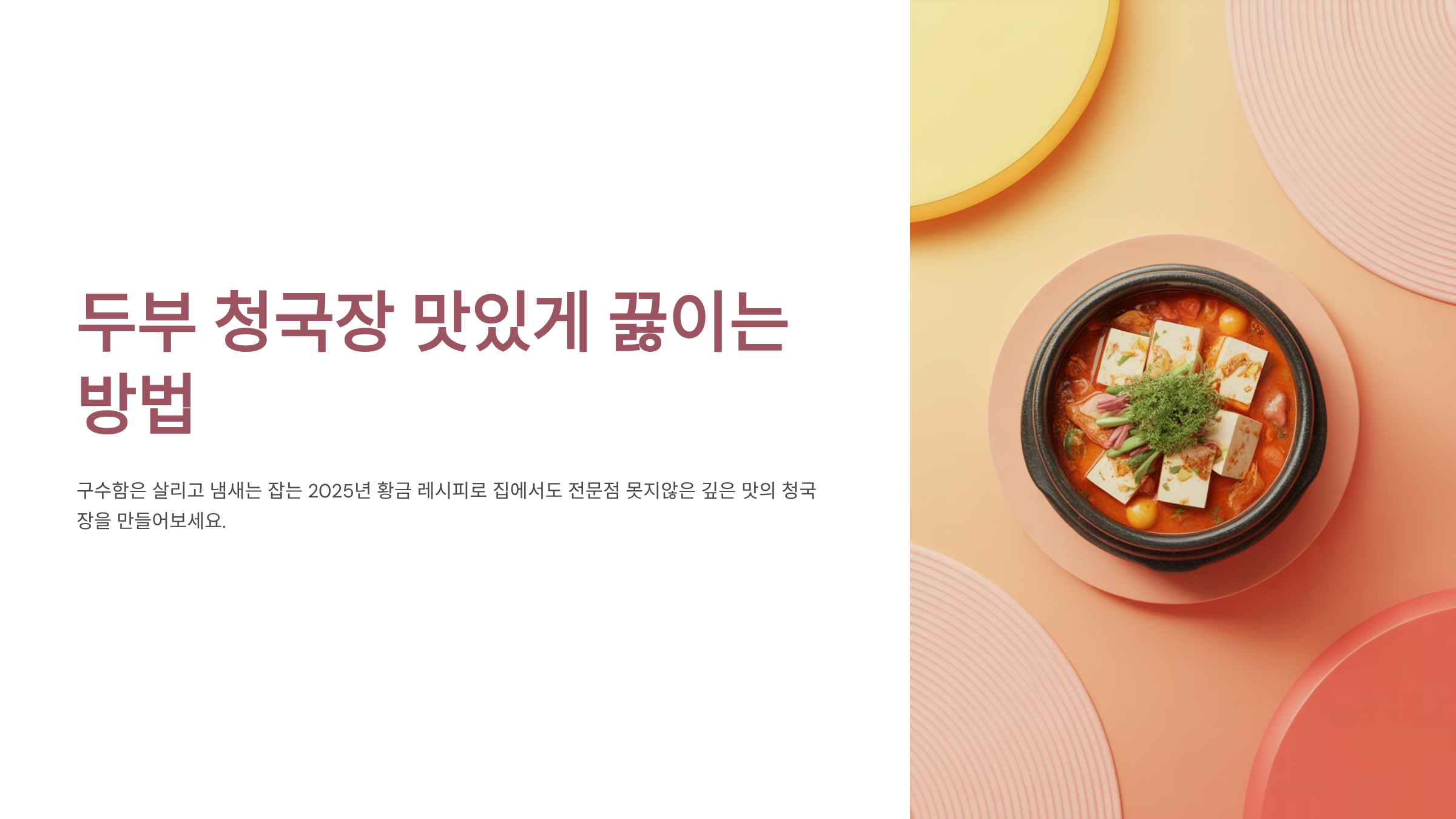 쌀쌀한 계절이 되면 유독 생각나는 음식, 바로 **청국장**입니다. 특히, 부드러운 두부를 듬뿍 넣고 끓여낸 두부 청국장찌개는 한국인의 밥상에서 빼놓을 수 없는 건강 밥도둑이죠. 하지만 청국장 특유의 강한 냄새 때문에 집에서 끓이기를 망설이는 분들이 많습니다. 본 포스팅은 이런 고민을 해결하고, 구수한 풍미는 살리고 불쾌한 냄새는 최소화하는 최신 조리법을 소개합니다. 단순히 재료를 넣고 끓이는 것을 넘어, 깊은 감칠맛을 내는 육수 비법과 청국장의 건강 효능까지 깊이 있게 다루어, 이 글을 읽는 모든 독자분들이 '진짜' 맛있는 두부 청국장을 완성할 수 있도록 돕는 것이 목표입니다. 지금부터 밥맛을 돋우는 청국장찌개의 세계로 안내하겠습니다.