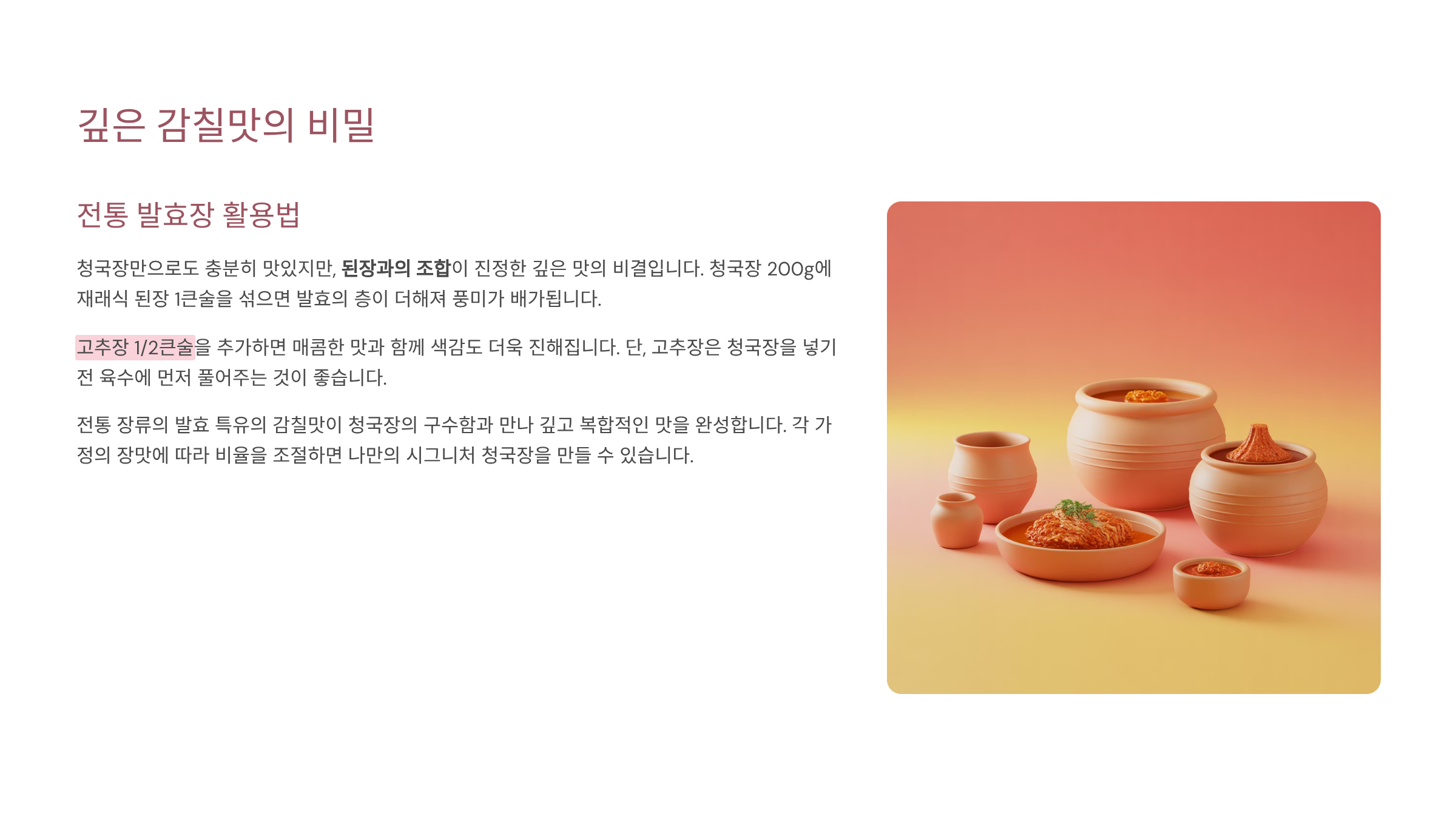 4. 깊은 감칠맛을 위한 전통적인 발효장(된장/고추장) 활용법 🍚