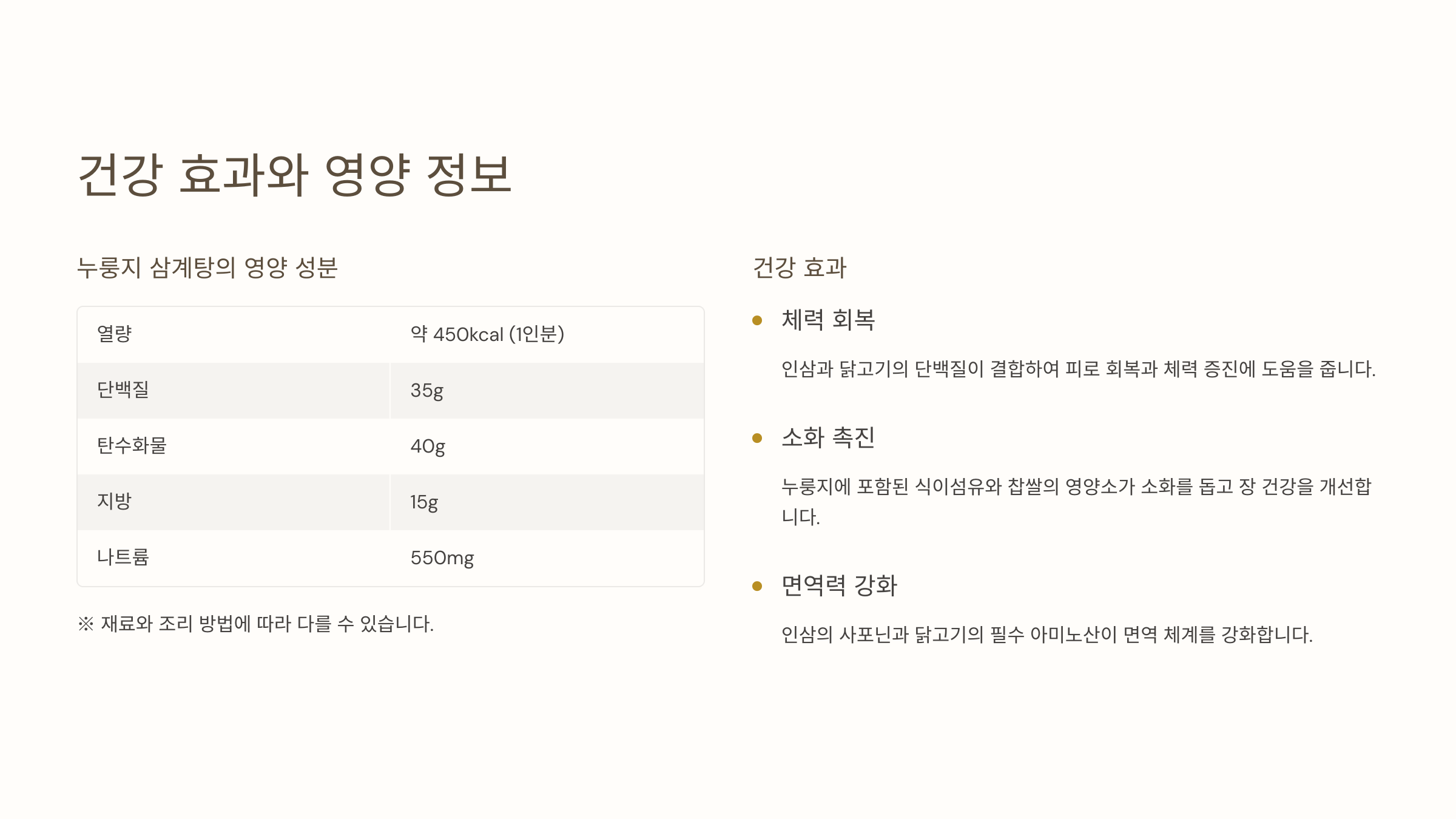 누룽지 삼계탕은 삼계탕의 전통적인 보양 효과는 그대로 유지하면서, 누룽지의 구수한 풍미가 더해져 다양한 입맛을 만족시켜요. 특히 집에서 간편하게 만들어 먹을 수 있어서 현대인에게 딱 맞는 메뉴죠.