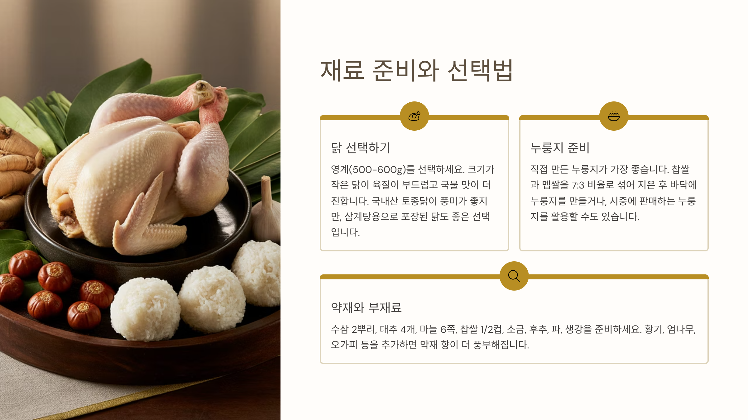 꼼꼼한 재료 준비가 누룽지 삼계탕의 성공을 좌우해요. 특히 닭의 신선도와 한방재료의 품질이 전체 맛과 건강에 큰 영향을 준답니다.