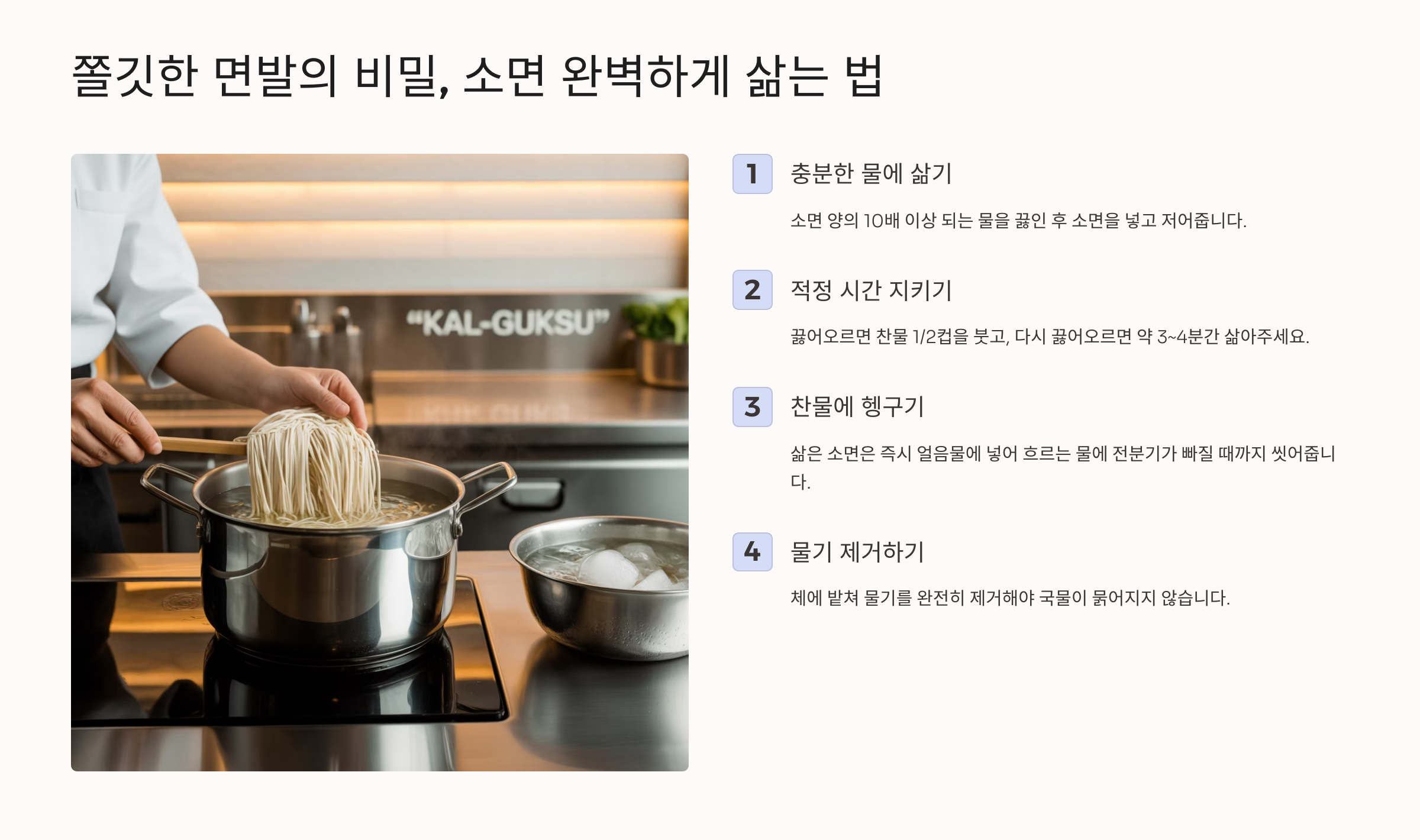 | 물 끓이기 | 냄비에 충분한 양의 물 붓고 끓이기 (소면 100g당 물 1L) | 물이 많아야 면이 잘 익음 |