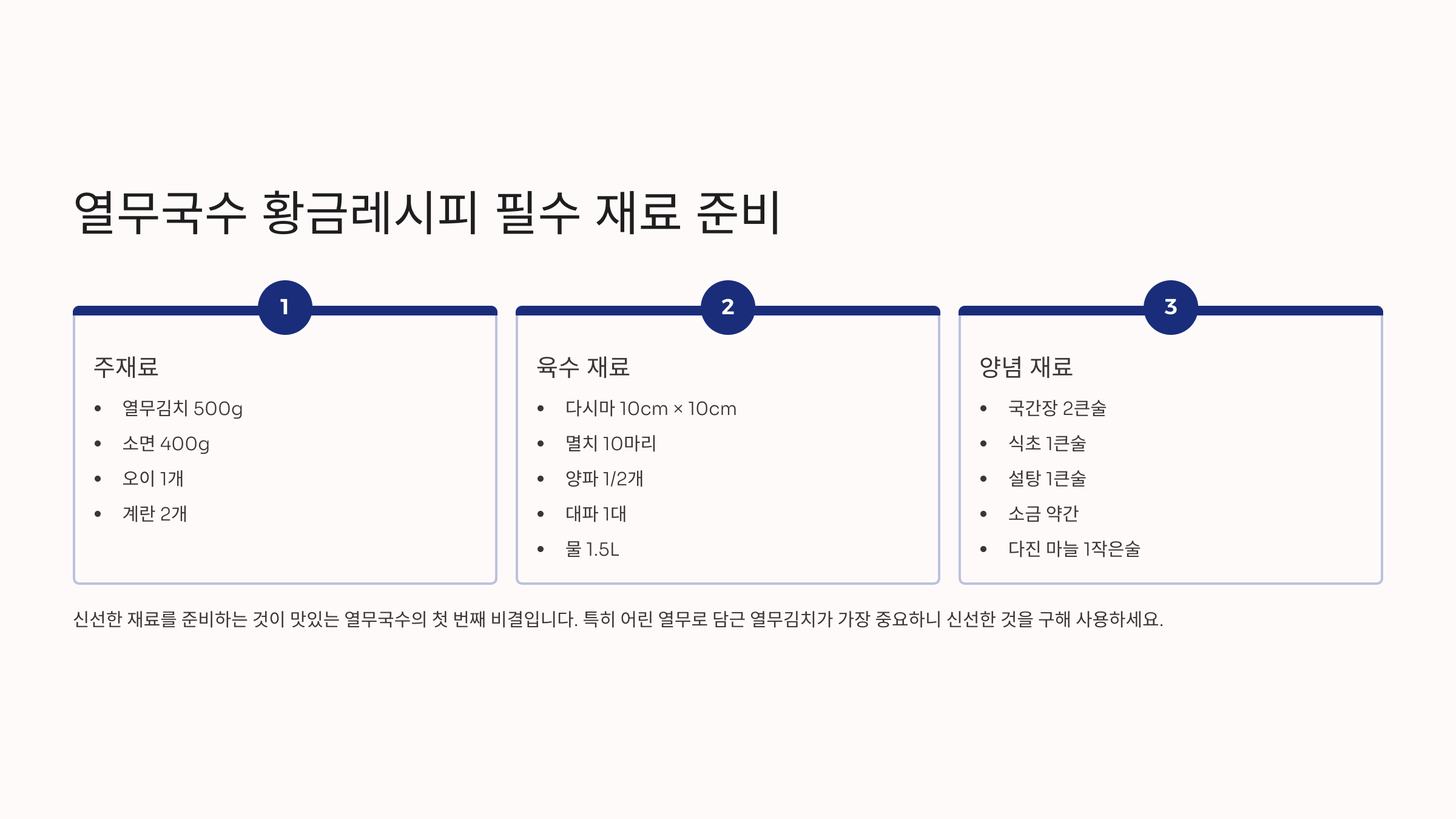| 핵심 재료 | 잘 익은 열무김치 | 300g (종이컵 3컵 정도), 김치 국물 활용 필수 |