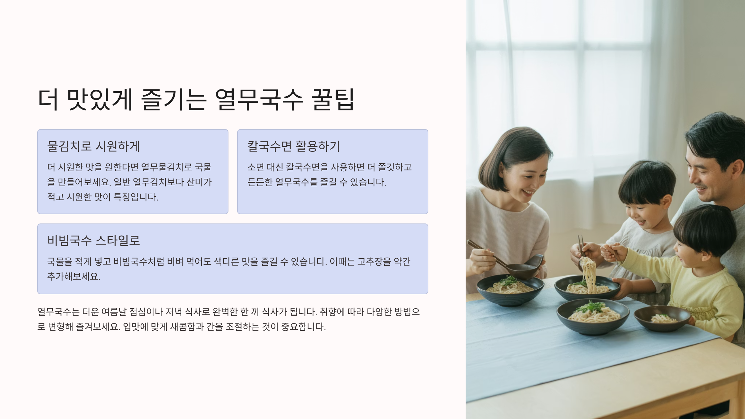 | 열무 물김치 활용 | 열무 물김치를 사용하면 더욱 깔끔하고 시원한 국물 맛 | 번거로운 양념 과정 단축 |