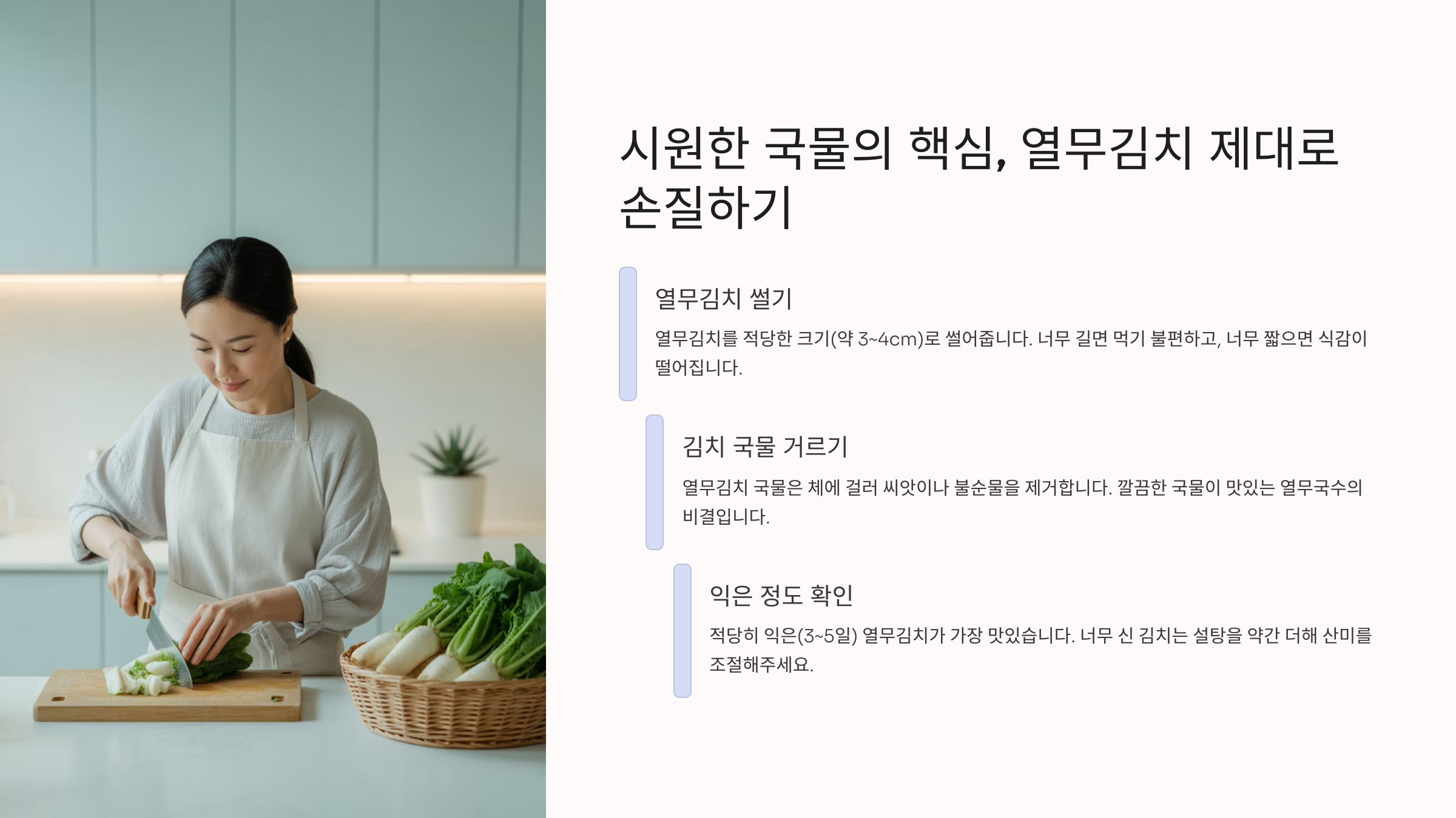 열무국수의 시원하고 깔끔한 맛은 **열무김치 손질**에서 시작됩니다. 열무김치는 너무 시지 않게 적당히 익은 것을 사용하는 것이 중요합니다. 만약 김치가 너무 시다면 찬물에 살짝 헹궈 신맛을 조절해주세요. 이때 김치를 너무 세게 짜거나 오랫동안 헹구면 특유의 아삭한 식감과 맛이 사라지므로 주의해야 합니다. 김치 국물은 열무국수 육수의 베이스가 되니 버리지 않고 따로 보관합니다.
