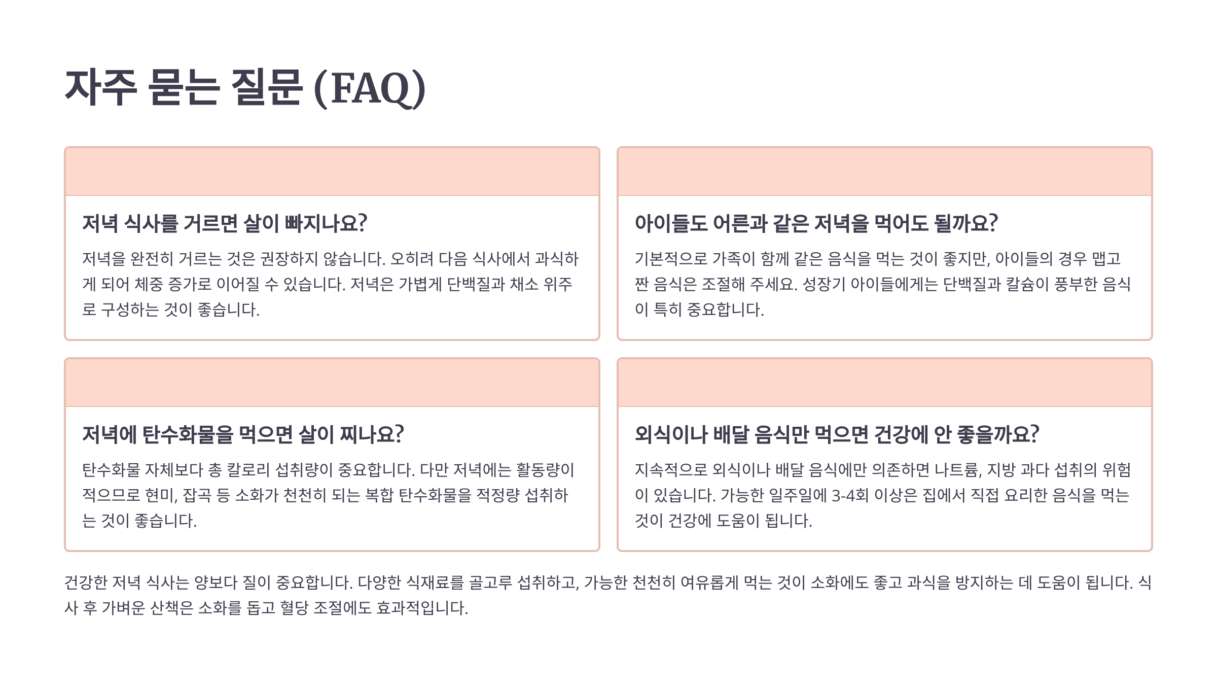 맛있는 것도 중요하지만, 건강을 위해서는 균형 잡힌 식단이 필수적입니다. 탄수화물, 단백질, 지방, 비타민, 무기질 등 5대 영양소를 골고루 섭취할 수 있도록 메뉴를 구성하는 것이 좋습니다. 특히 저녁에는 소화를 돕고 숙면을 취할 수 있도록 너무 기름지거나 자극적인 음식보다는 담백하고 가벼운 메뉴를 선택하는 것이 현명합니다. 제철 채소와 단백질 위주의 식단으로 건강하고 활기찬 내일을 준비해 보세요.