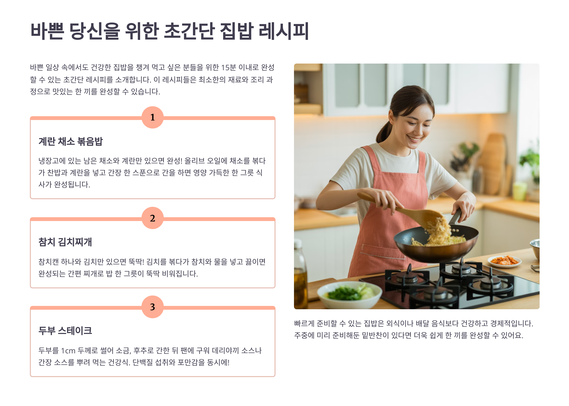 바쁜 일상 속에서 요리에 많은 시간을 할애하기는 쉽지 않습니다. 하지만 간단하고 빠르게 만들 수 있는 집밥 레시피만 안다면, 외식이나 배달 음식의 유혹을 뿌리치고 건강하고 맛있는 한 끼를 즐길 수 있습니다. 냉장고에 있는 재료를 활용하거나, 미리 손질해 둔 재료를 사용하면 조리 시간을 더욱 단축시킬 수 있습니다. 15~30분 내외로 뚝딱 만들 수 있는 메뉴들을 소개합니다.