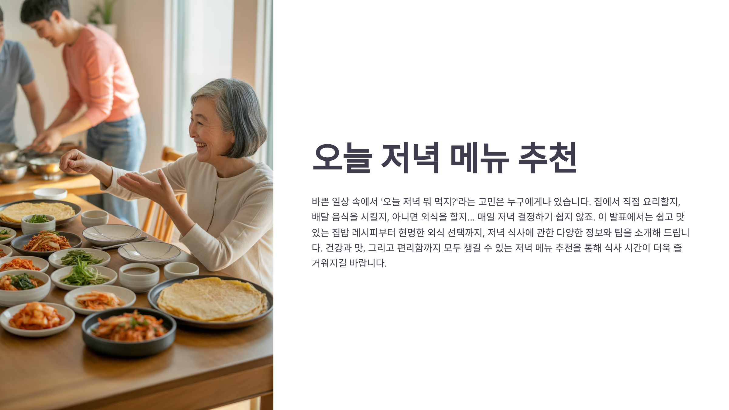 저녁 식사는 하루의 고단함을 씻어내고 에너지를 충전하는 중요한 시간입니다. 건강하고 맛있는 저녁 식사는 다음 날을 위한 활력을 불어넣어 줄 뿐만 아니라, 사랑하는 사람들과 함께하는 소중한 추억이 되기도 합니다. 하지만 복잡한 레시피나 준비 시간 때문에 선뜻 요리하기를 망설이거나, 매번 같은 메뉴만 고집하게 되는 경우가 많습니다.