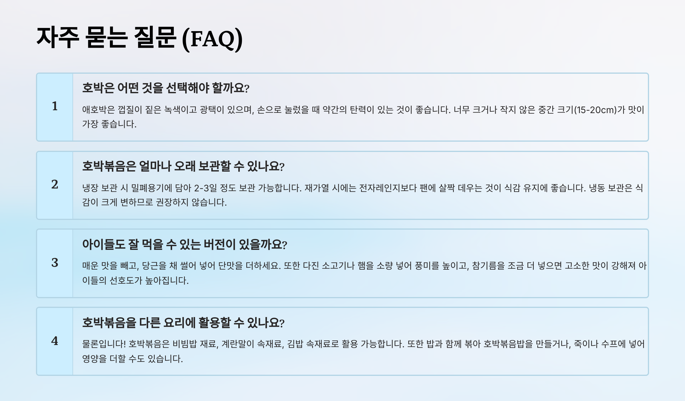 | 볶는 시간 조절 | 호박이 투명해지기 시작하면 바로 마무리 | 최적의 식감 유지 |