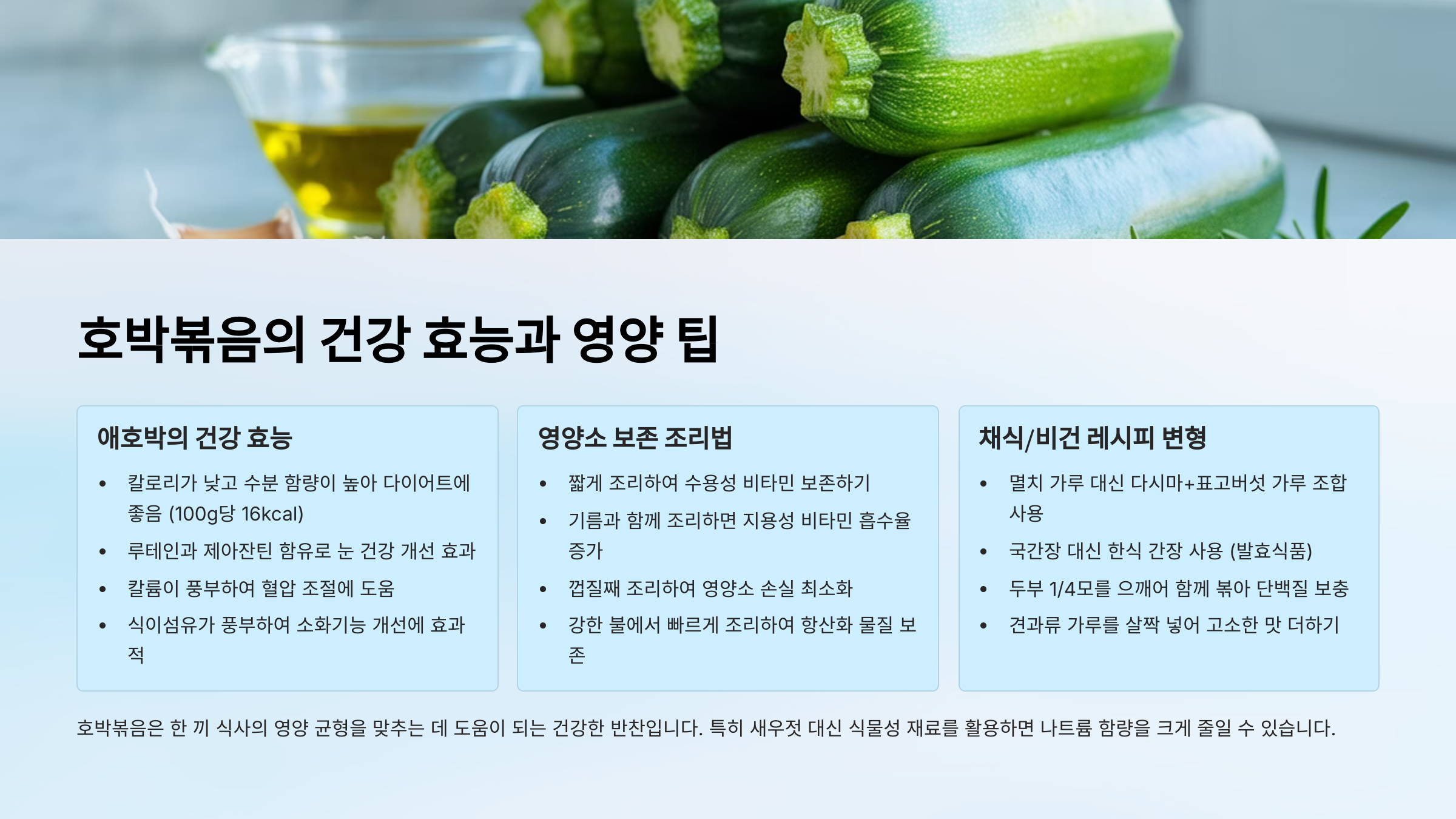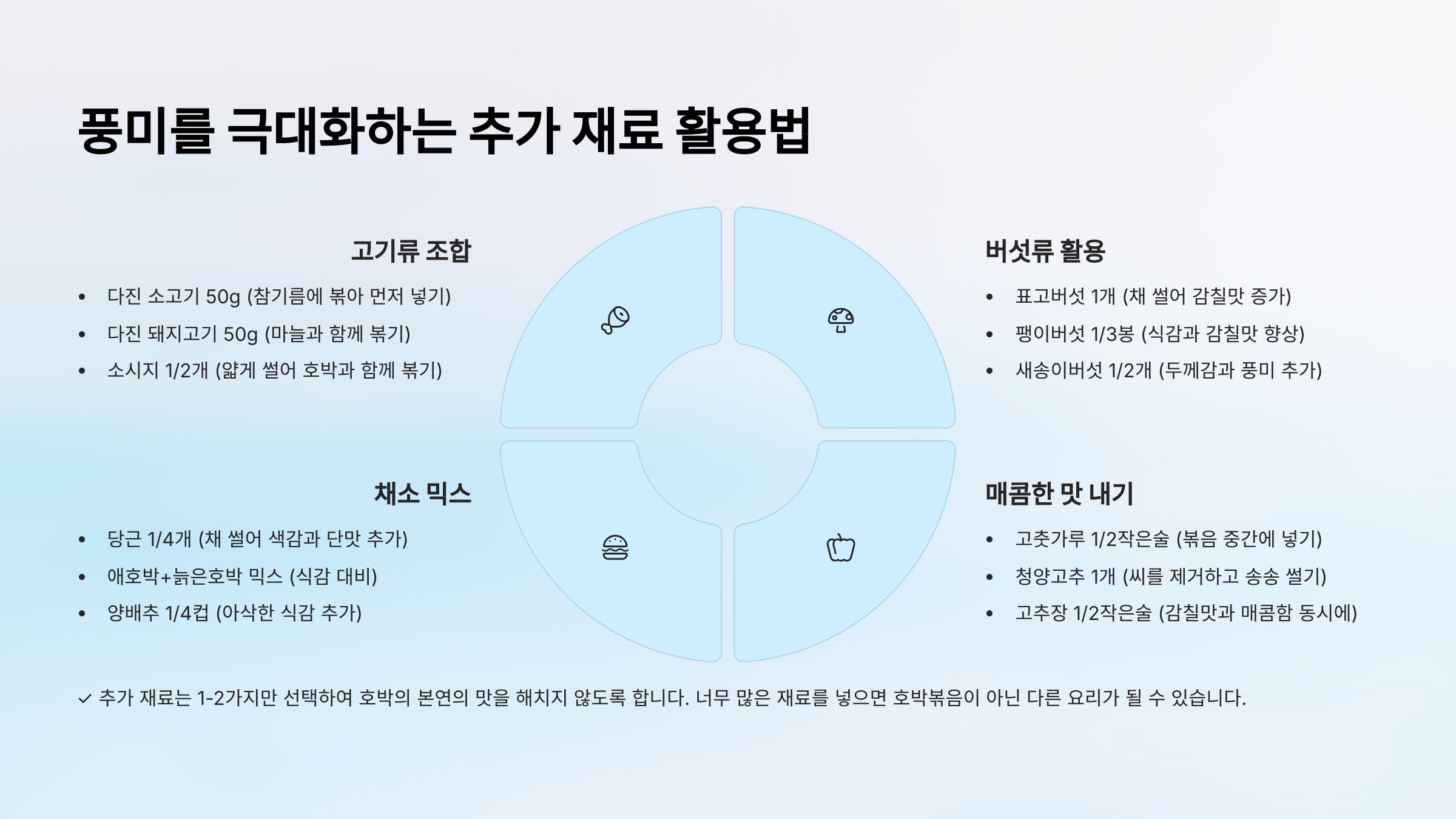| 연두부/순두부 | 부드러운 감칠맛, 단백질 보충 | 으깨어 호박과 함께 볶거나 양념에 섞기 |