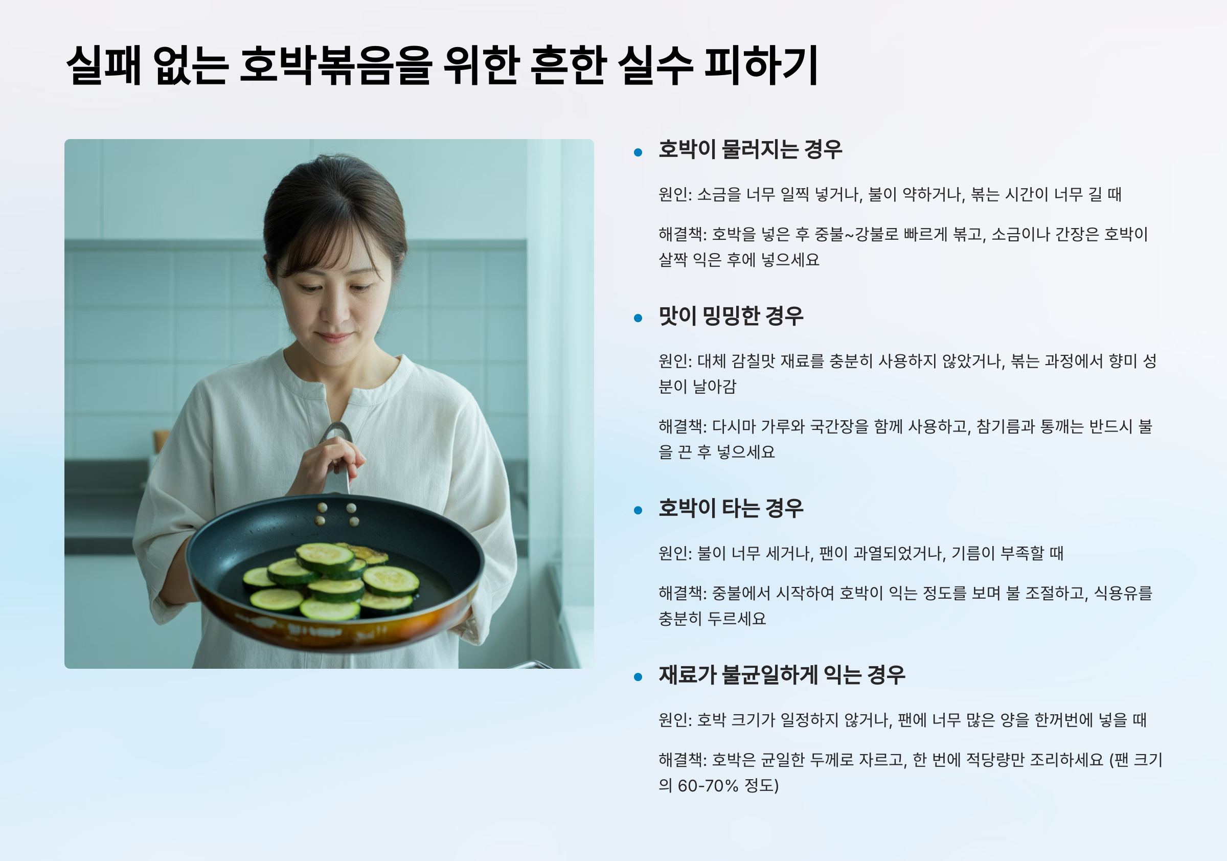 | 수분 조절 실패 | 호박볶음이 질척거림 | 볶기 전 소금 절이기, 육수 양 조절 |