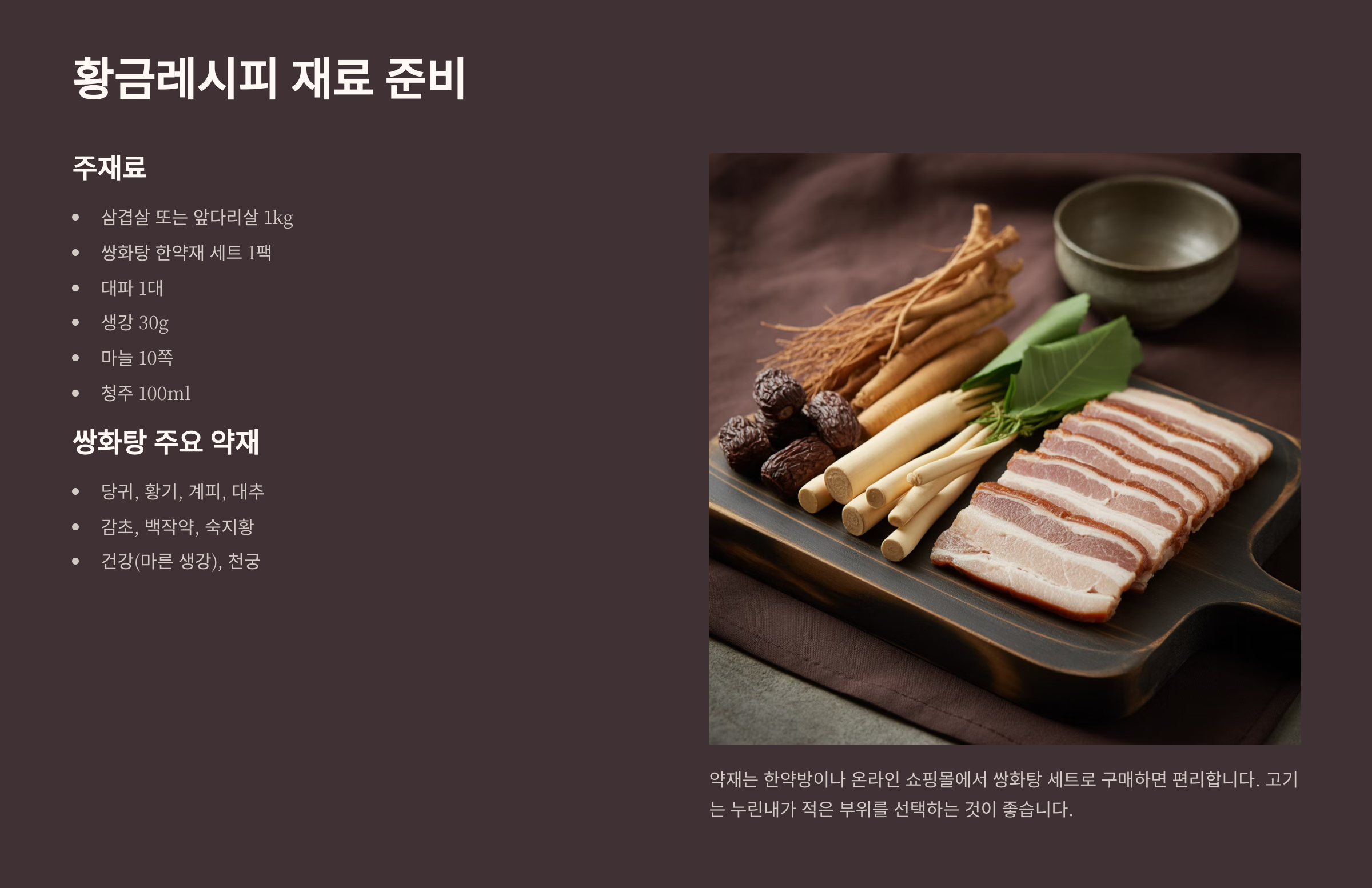 이 글에서는 집에서도 쉽게 만들 수 있는 쌍화탕 수육의 황금레시피를 공개합니다. 재료 손질부터 조리 과정, 그리고 맛있게 즐기는 팁까지 상세하게 안내해 드릴 테니, 올가을과 겨울, 온 가족의 건강을 책임질 쌍화탕 수육으로 따뜻하고 든든한 시간을 보내시길 바랍니다.