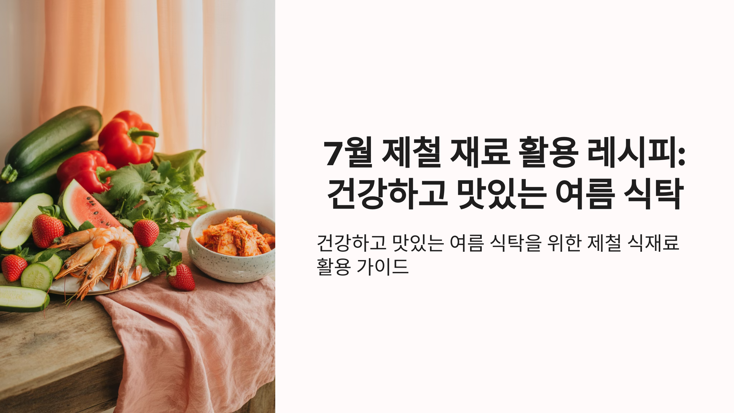 이 글에서는 7월에 가장 맛있고 영양 가득한 제철 재료들을 소개하고, 이를 활용한 쉽고 맛있는 레시피들을 함께 나누고자 합니다. 바쁜 일상 속에서도 건강하고 활력 넘치는 여름을 보낼 수 있도록, 간단하면서도 특별한 맛을 선사할 요리들을 만나보세요. 온 가족이 함께 즐길 수 있는 식탁을 제철 재료로 풍성하게 채워보세요.