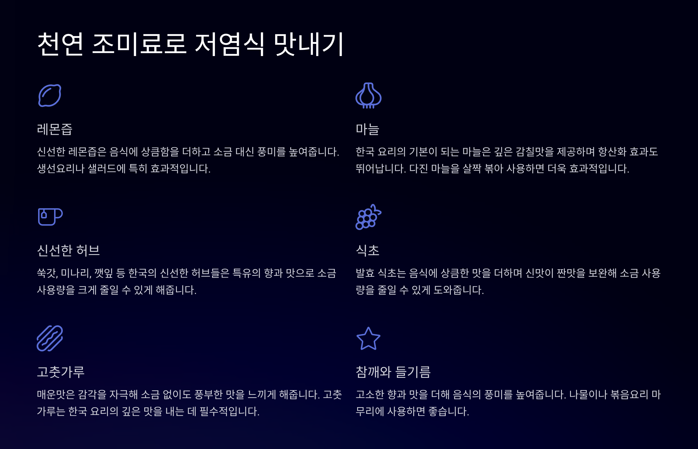 | 소금 사용 최소화 | 저염 간장/된장 사용, 소금 대신 다른 양념 활용 | 나트륨 섭취량 직접 감소 |