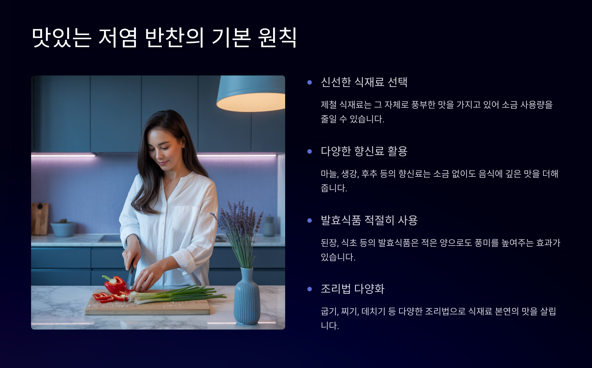 세 번째 원칙은 **'염분 배출을 돕는 식재료 적극 활용'**입니다. 칼륨이 풍부한 채소(시금치, 버섯, 브로콜리), 과일(바나나, 키위), 해조류(미역, 다시마) 등은 체내 나트륨 배출을 돕습니다. 이러한 식재료들을 반찬에 다양하게 활용하면 맛과 영양, 그리고 건강까지 동시에 잡을 수 있습니다. 이 외에도 식초, 레몬즙, 후추 등 새콤하거나 알싸한 맛으로 미각을 자극하여 염분 부족을 보완할 수 있습니다.