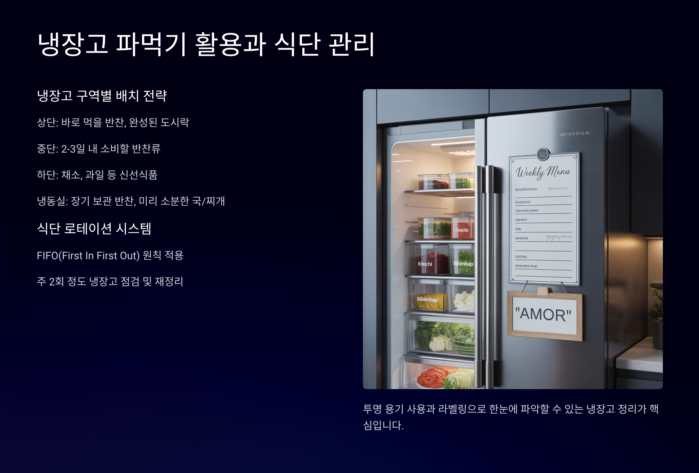 냉장고 파먹기는 단순히 절약 습관을 넘어, 주부의 부담을 덜고 가족의 건강한 식생활을 책임지는 스마트한 라이프스타일입니다. 미리 준비된 밑반찬과 체계적인 식단 관리를 통해, 매일매일 건강하고 맛있는 집밥을 즐기며 여유로운 일상을 누릴 수 있을 것입니다. 이제 여러분의 냉장고를 효율적으로 '파먹는' 즐거움을 만끽해보세요!