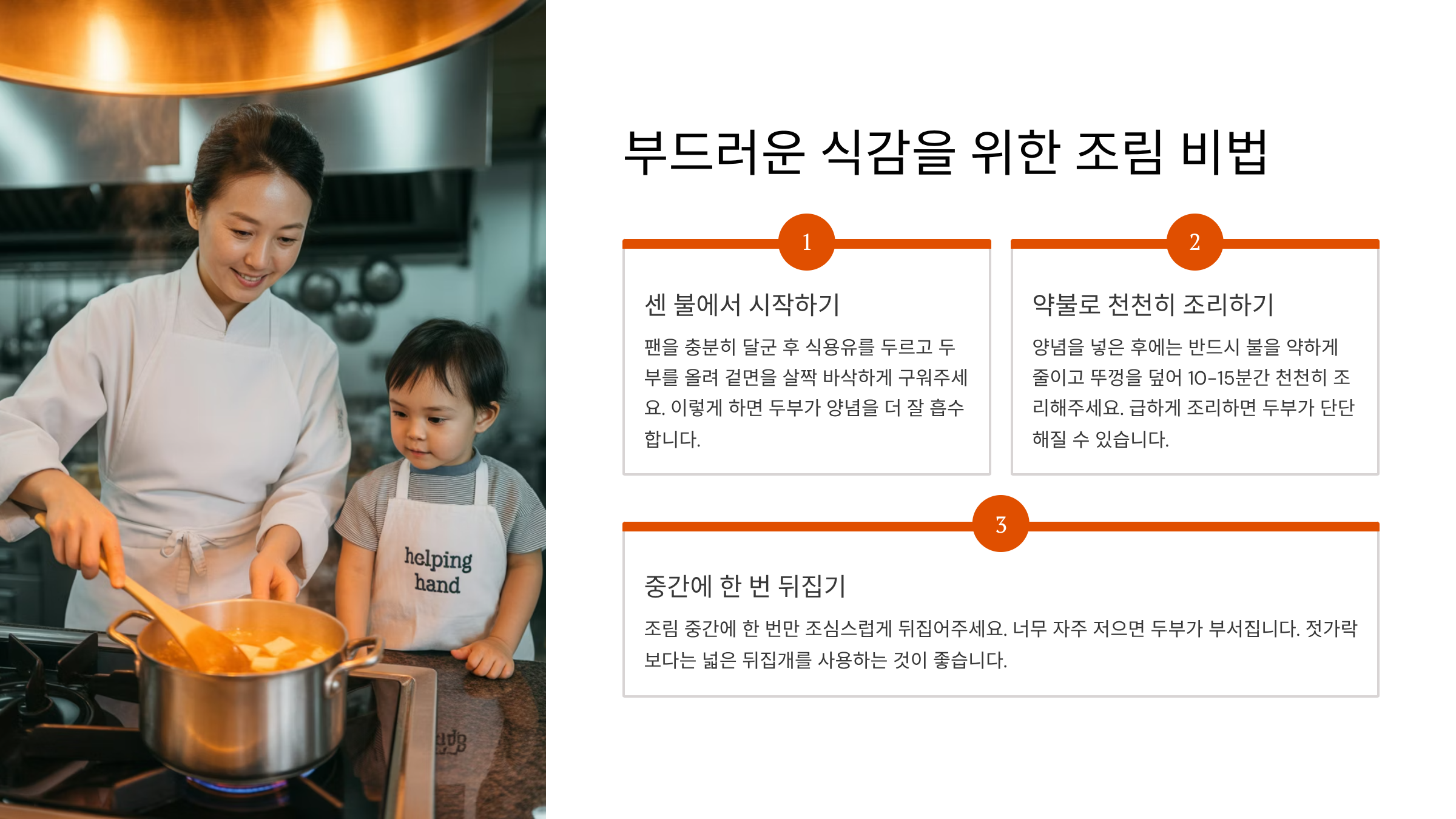 | 약불에서 조리기 | 뚜껑 닫고 약불에서 10~15분간 서서히 조리기 | 양념이 두부에 충분히 스며들도록 |