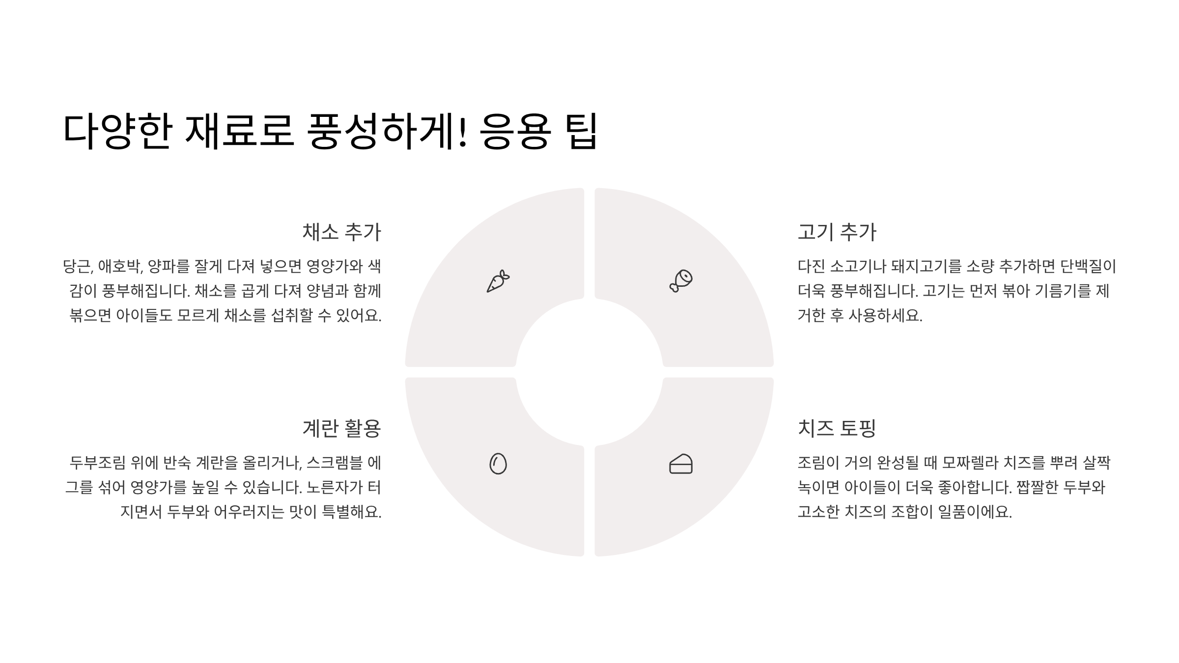 | 양파, 당근 | 단맛, 비타민, 식감 | 두부와 함께 조리기 |