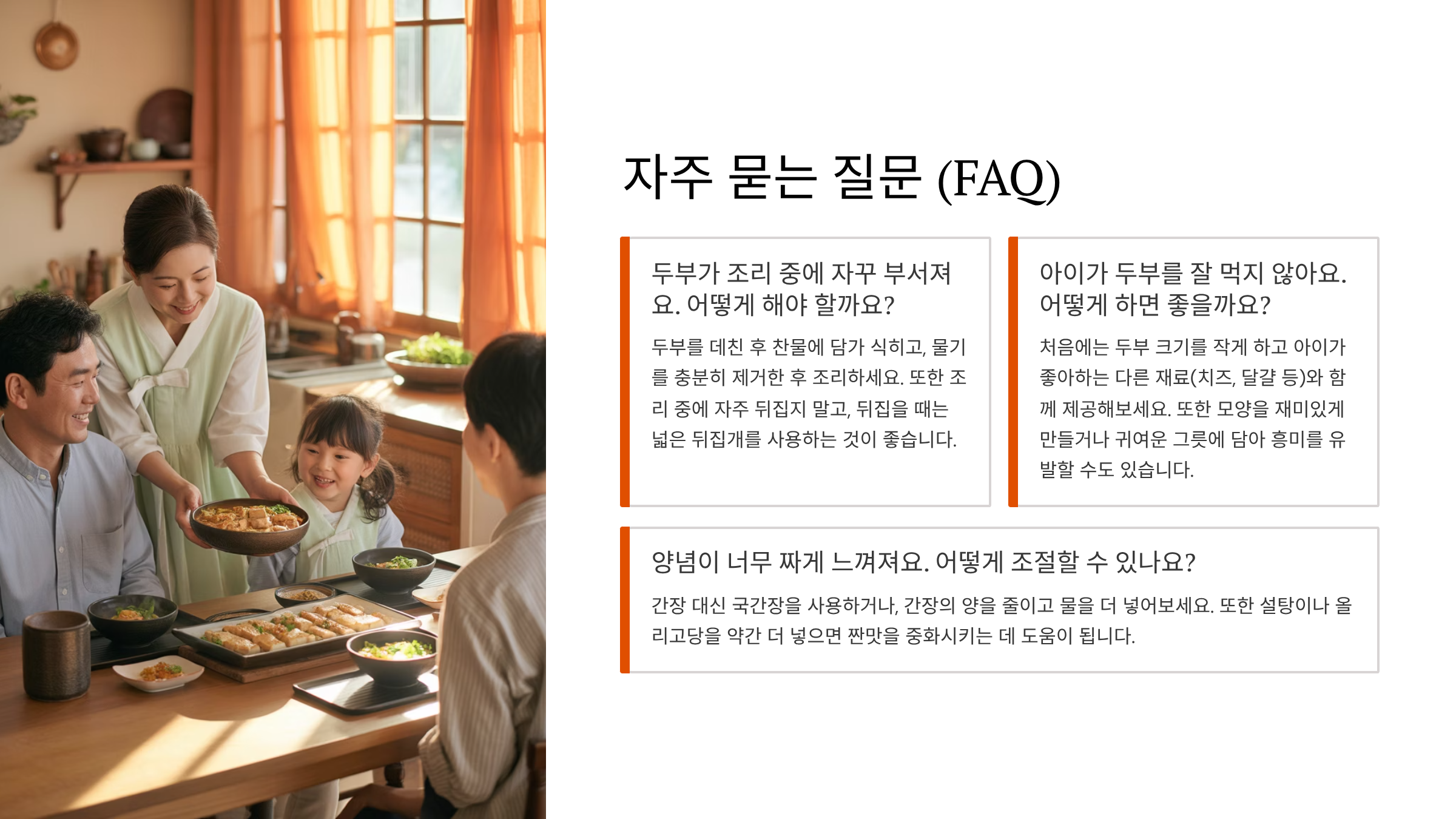 A9: 두부를 더 얇게 썰거나, 양념장을 미리 끓여 두부를 넣으면 조리 시간을 단축할 수 있습니다.