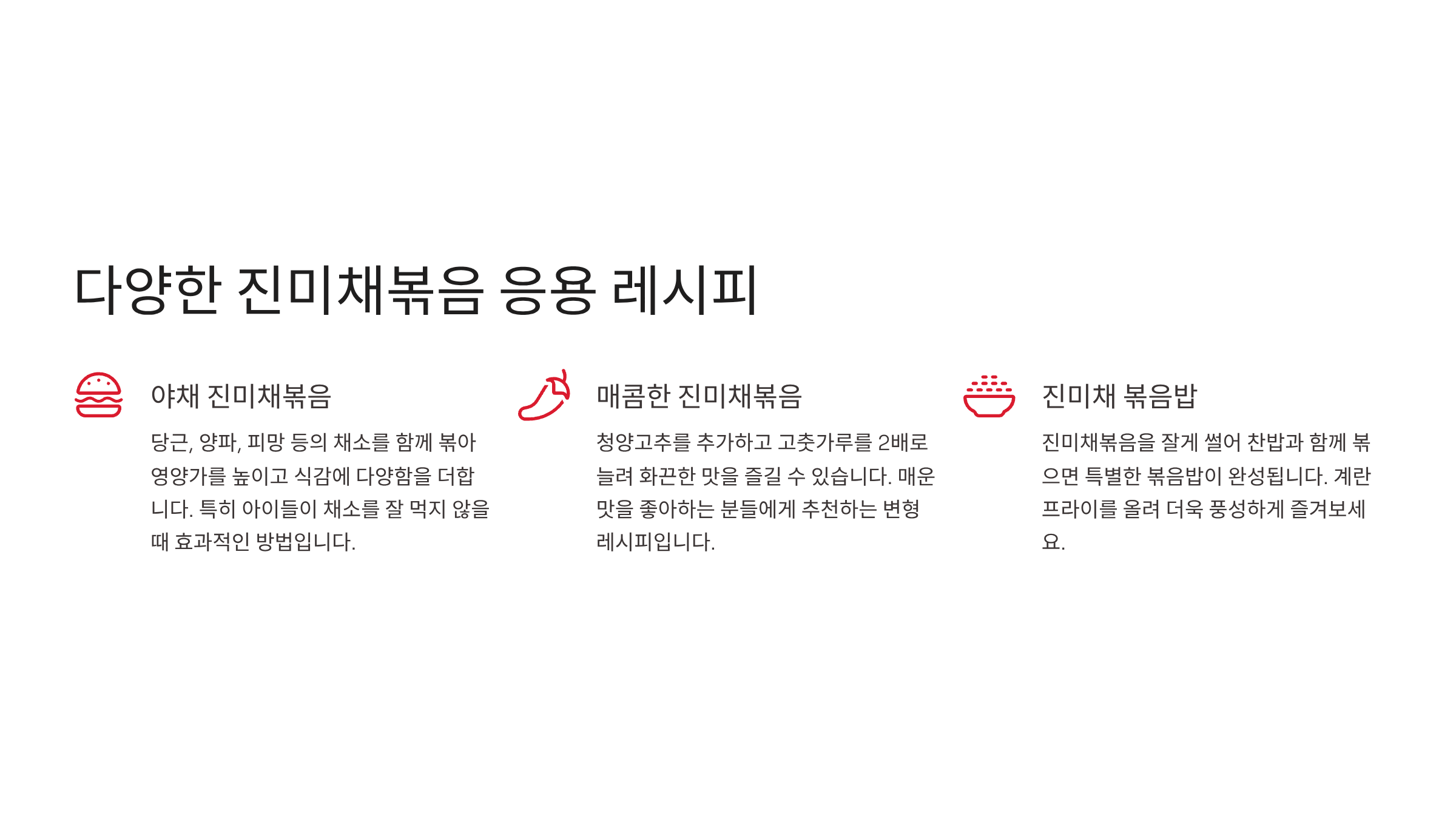 | **볶음밥/김밥 재료** | 고추장 진미채볶음 또는 간장 진미채볶음 활용 | 볶음밥이나 김밥의 속 재료로 넣어 특별한 맛을 낼 수 있음 |