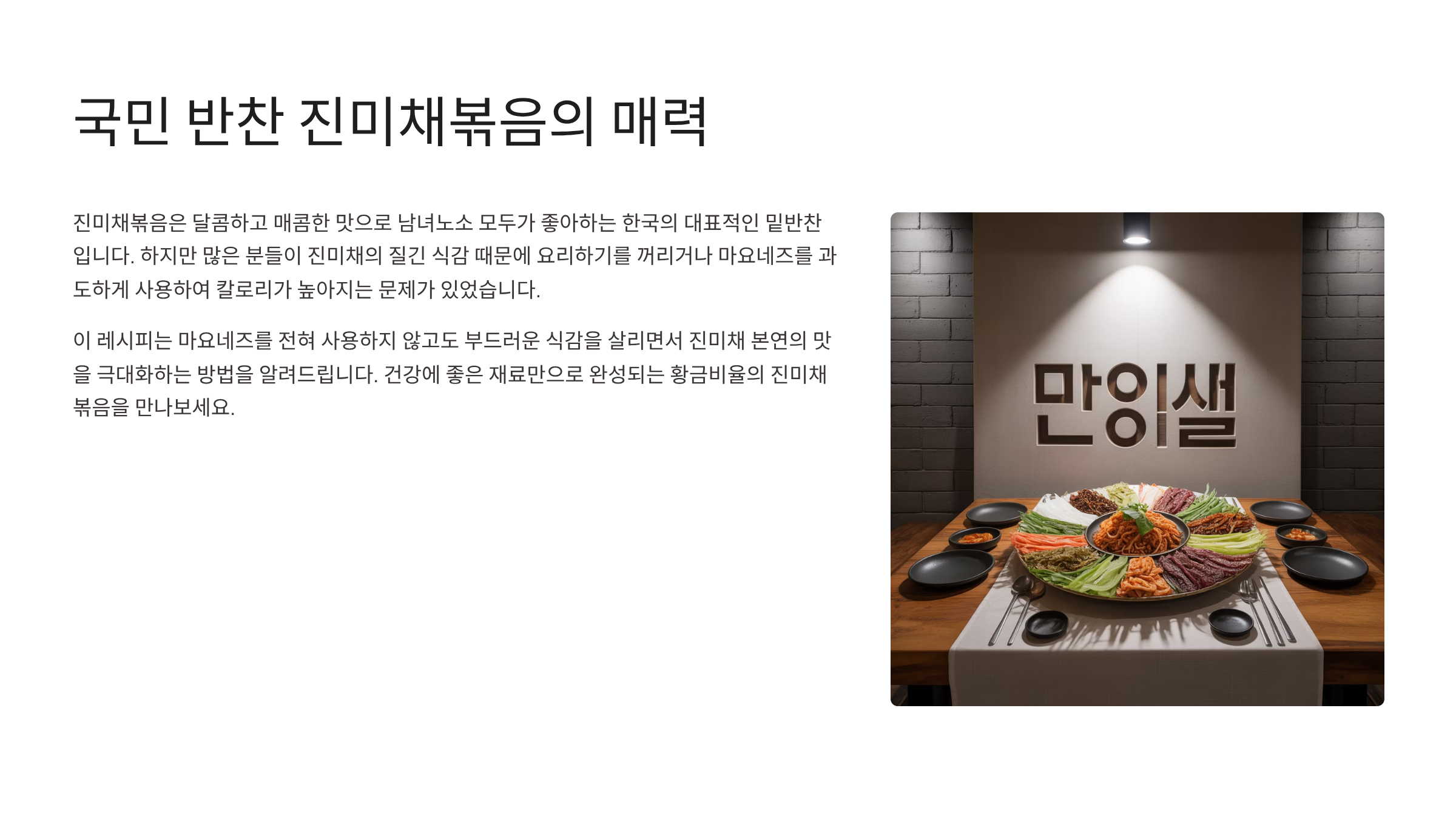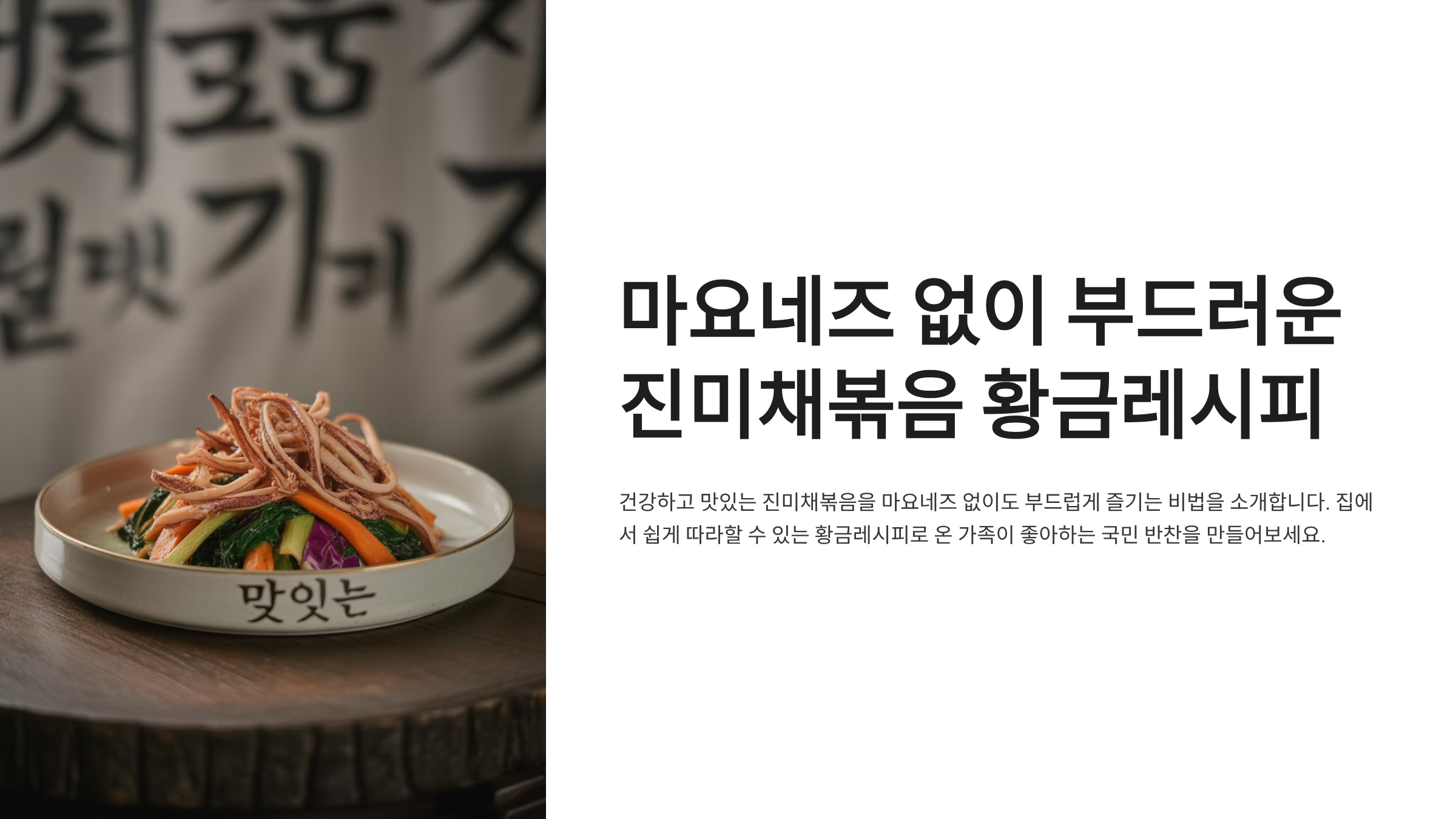 대한민국 식탁에서 빼놓을 수 없는 국민 반찬, 바로 **진미채볶음**입니다. 매콤달콤한 맛과 쫄깃한 식감으로 많은 사랑을 받지만, 때로는 딱딱해지거나 뻣뻣해져 아쉬움을 남기기도 합니다. 특히 마요네즈를 사용하지 않고도 진미채의 부드러움을 살리는 방법에 대한 궁금증이 많으실 텐데요. 오늘 이 글에서는 그 해답을 명확히 제시해 드리고자 합니다.