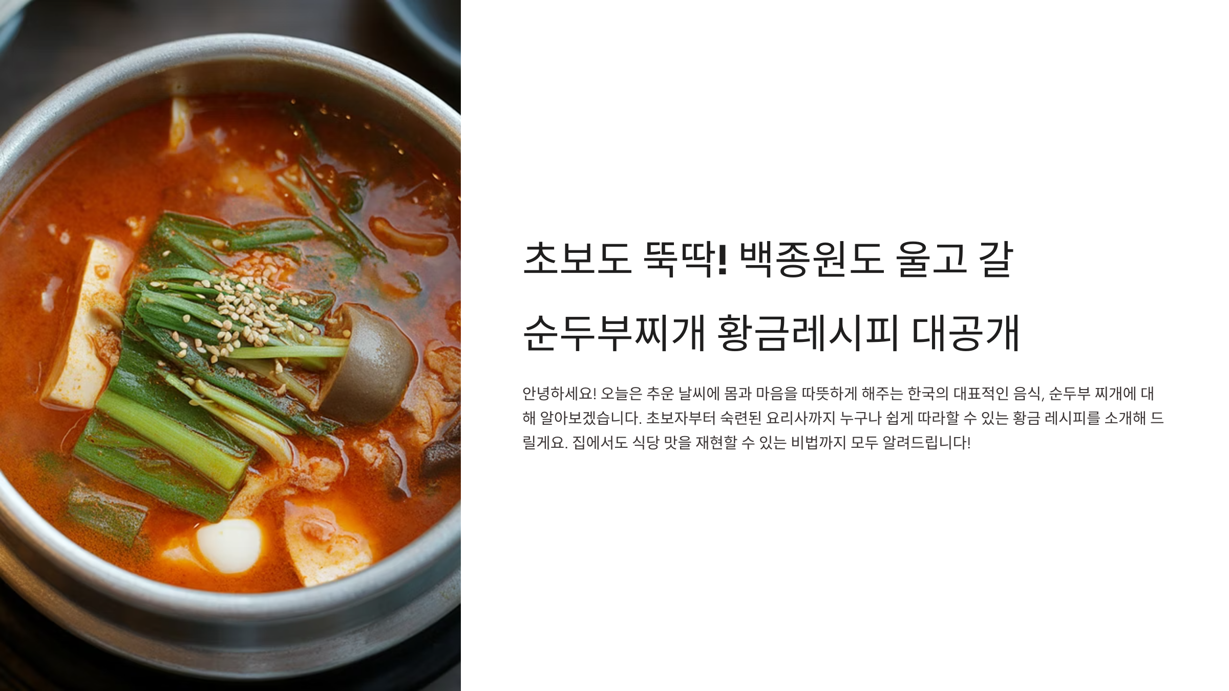 이 글에서는 재료 준비부터 육수 내기, 조리법, 맛있게 먹는 팁과 변형 레시피, 자주 묻는 질문까지 꼼꼼하게 다룰게요. 함께 황금레시피로 맛있는 순두부 찌개를 만들어봐요!