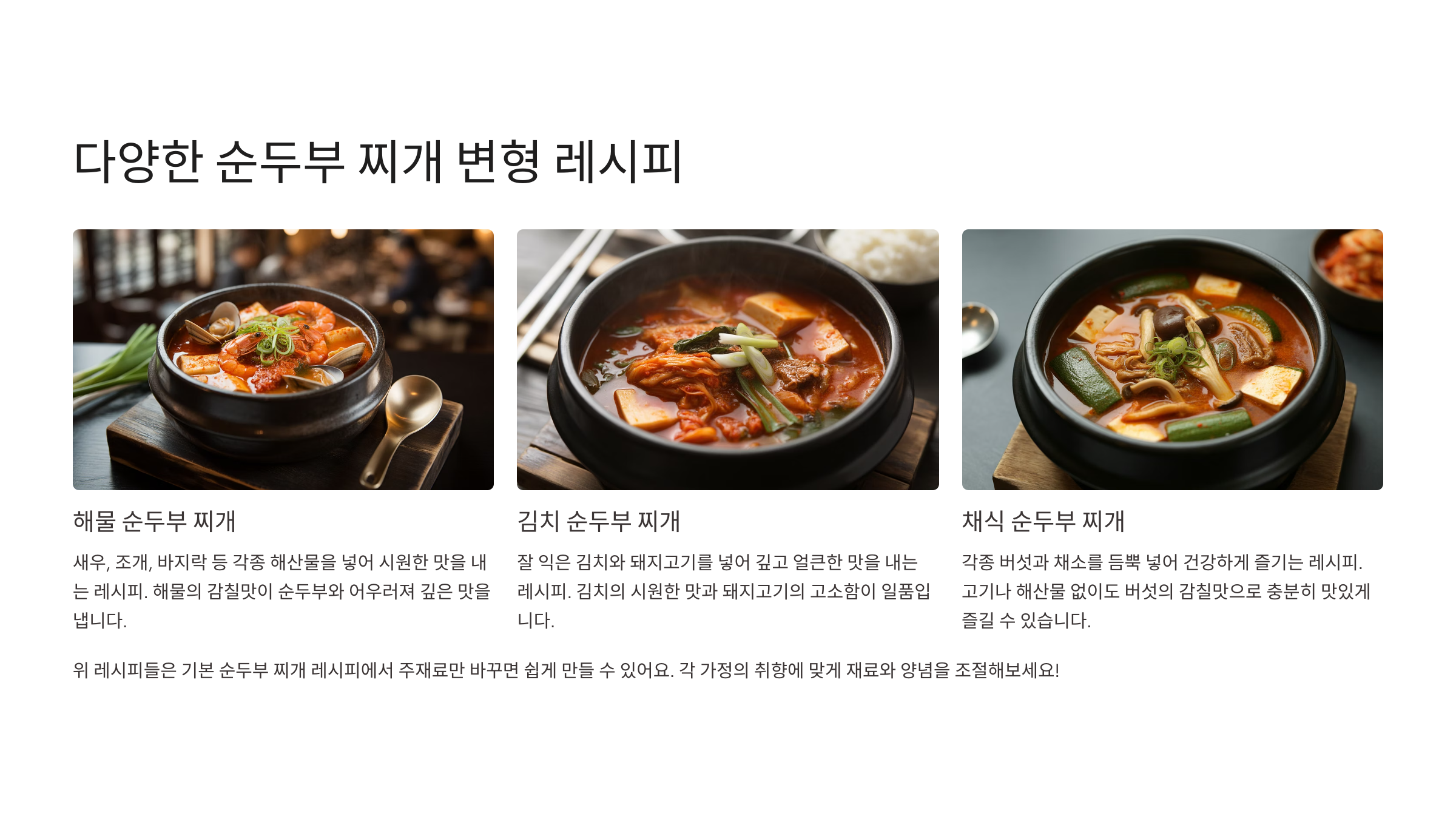 순두부 찌개는 다양한 변형이 가능해요. 해산물 순두부 찌개, 김치 순두부 찌개, 채식 순두부 찌개가 대표적이에요. 각 재료와 양념으로 맛이 다채로워집니다.