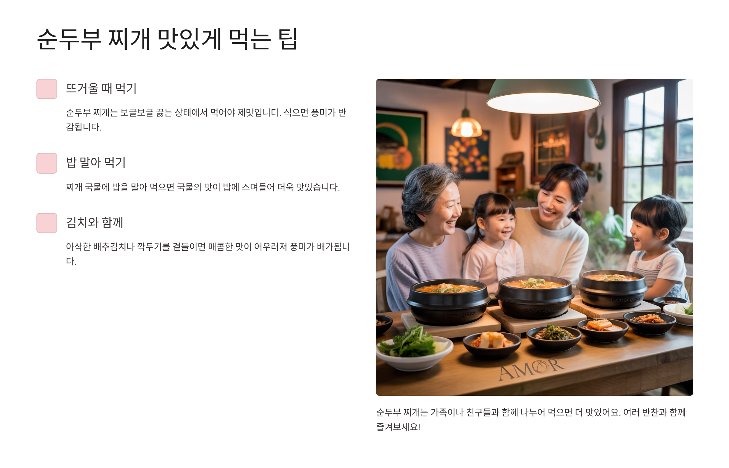 순두부 찌개는 밥과 함께 먹을 때 가장 맛있어요. 매콤한 찌개 국물에 밥을 말아 먹으면 환상의 조합이 된답니다. 김치나 깻잎 장아찌와 곁들이면 더욱 좋아요.
