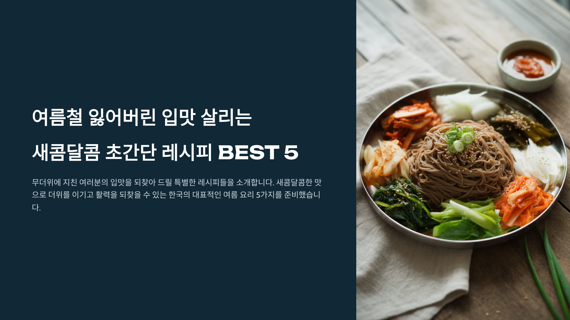 이 글에서는 요리 초보도 쉽게 따라 할 수 있는 **새콤달콤 초간단 여름철 레시피 BEST 5**를 엄선하여 소개합니다. 지친 몸과 마음에 활력을 불어넣어 줄 시원하고 맛있는 음식들로 올여름을 건강하고 활기차게 보내시길 바랍니다. 지금부터 바로 시작해볼까요?