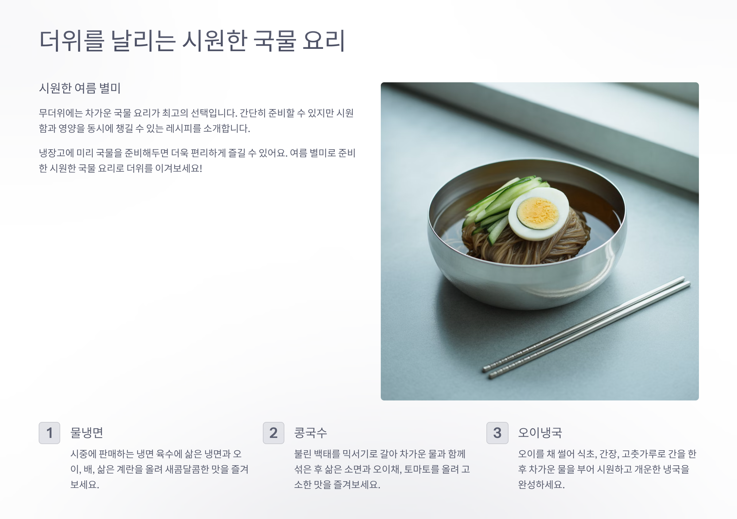 본 블로그 글에 포함된 모든 요리 정보는 일반적인 참고를 위한 것이며, 개인의 건강 상태, 알레르기 유무, 식단 제한 등을 고려하여 조리 및 섭취해야 합니다. 특히 여름철에는 식재료의 신선도와 위생 관리에 각별히 유의하여 식중독을 예방하시기 바랍니다. 본 정보에 기반한 어떠한 결정이나 행위로 인해 발생할 수 있는 결과에 대해 작성자는 책임을 지지 않습니다.