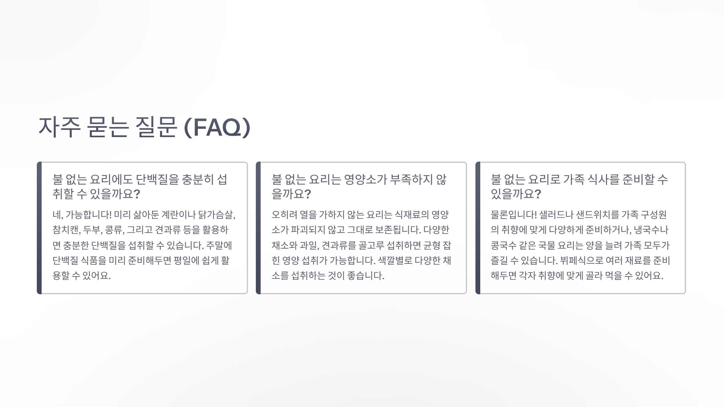 불 없는 요리는 단순히 더위를 피하는 것을 넘어, 신선한 재료 본연의 맛을 살리고 조리 시간을 단축하는 등 여러 가지 장점을 가지고 있습니다. 복잡한 과정 없이 누구나 쉽게 따라 할 수 있는 레시피가 많아 요리 초보자도 부담 없이 도전할 수 있죠. 또한, 미리 준비해 두면 바쁜 일상 속에서도 건강한 식사를 놓치지 않을 수 있어 더욱 실용적입니다.