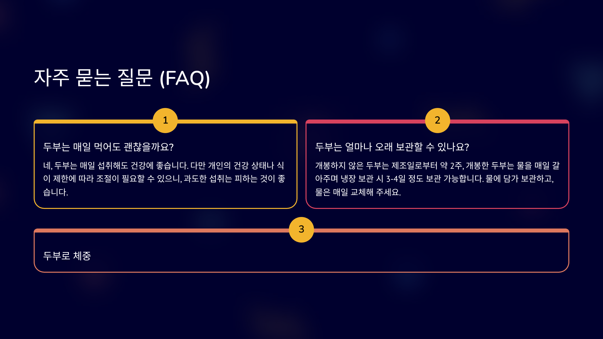 주 3~4회 이상 규칙적으로 포함하면 좋습니다. 한 끼 식사 전체를 두부로 대체하거나, 다른 요리에 두부를 추가하는 방식으로 활용할 수 있습니다.
