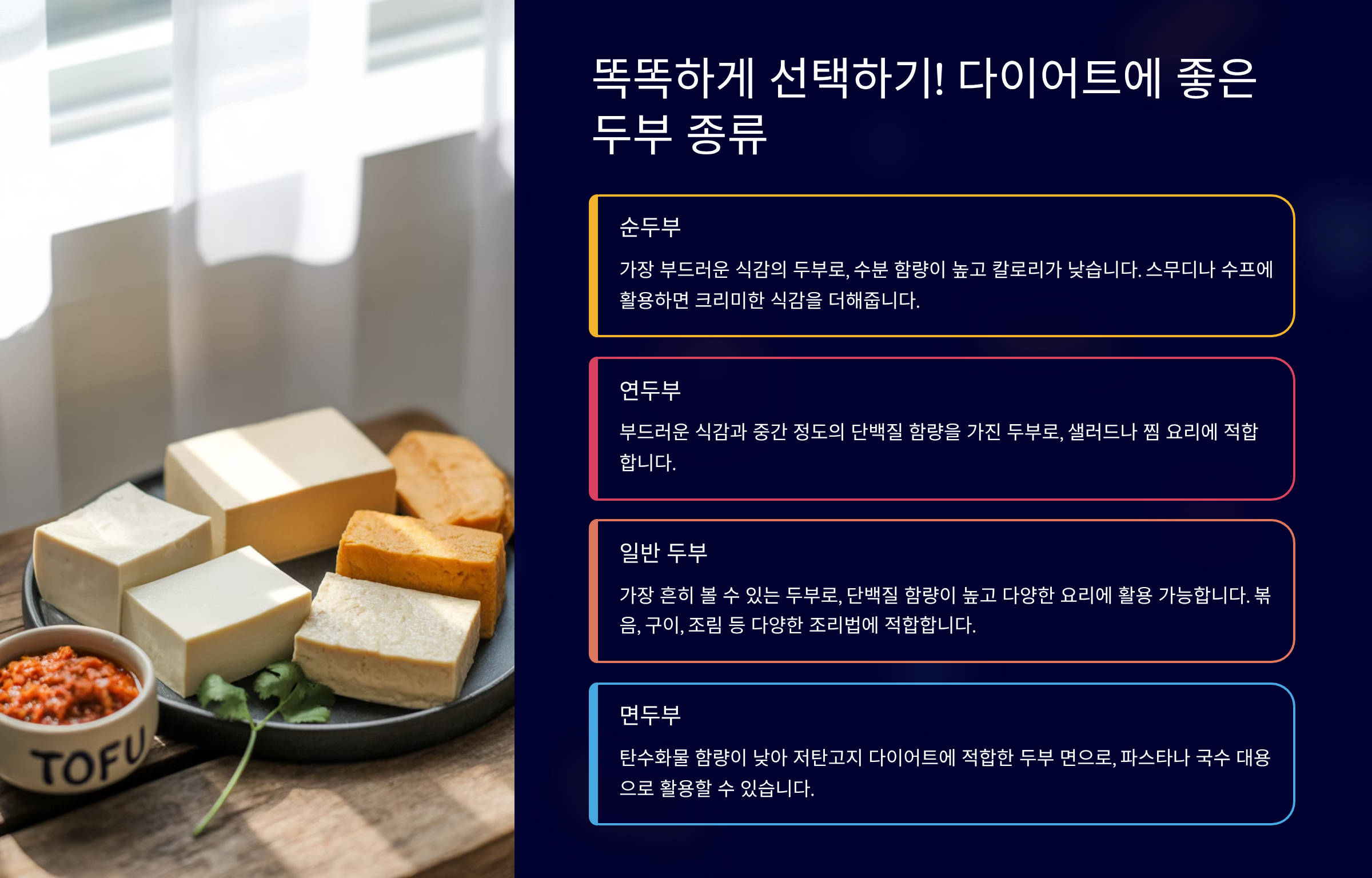 | 두부 종류 | 특징 | 다이어트 활용법 | 주의 사항 |