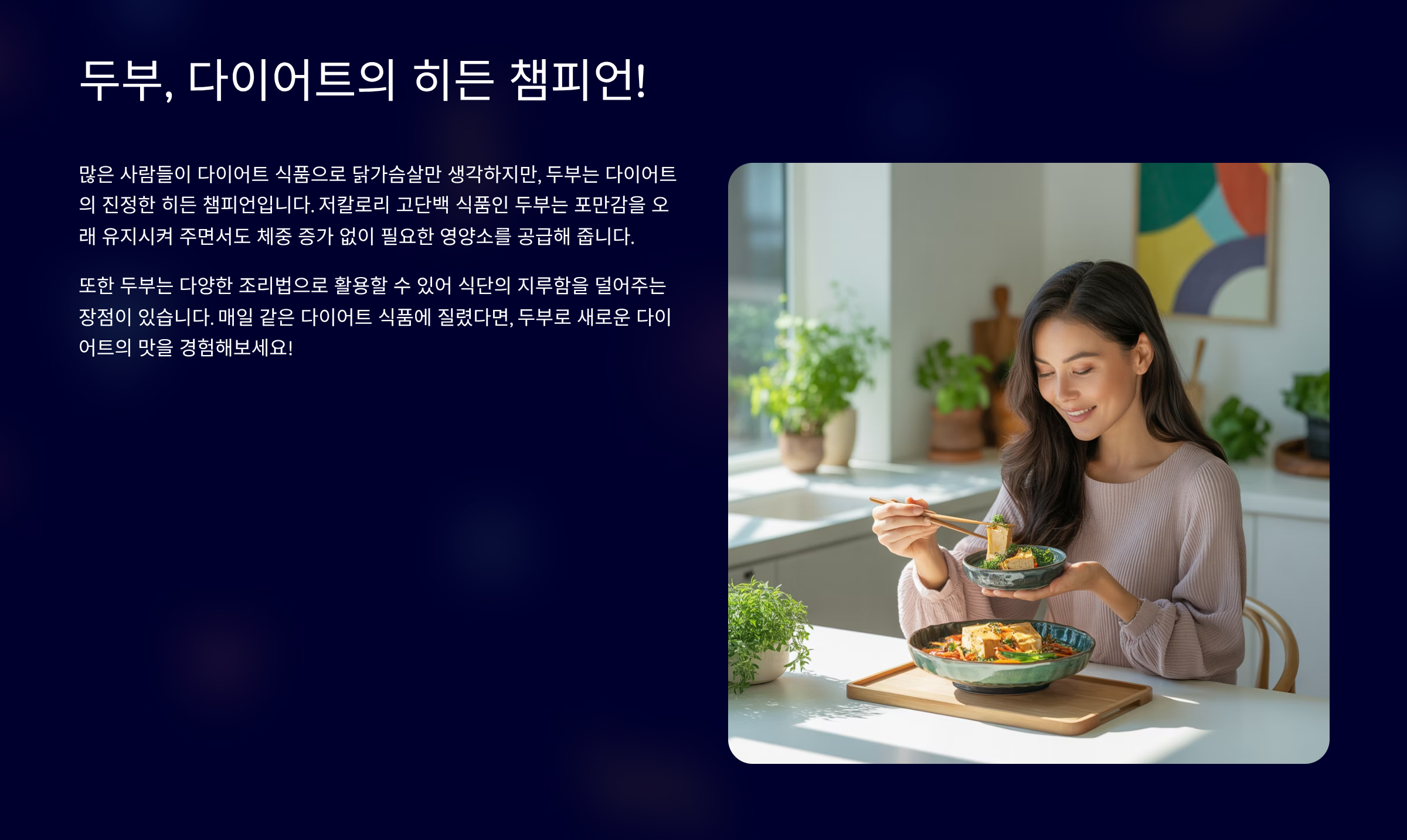 두부는 '밭에서 나는 소고기'라고 불릴 만큼 풍부한 단백질을 함유하고 있으면서도 칼로리가 매우 낮아 다이어트에 이상적인 식품입니다. 포만감을 오래 유지시켜주어 불필요한 간식 섭취를 줄여주고, 필수 아미노산과 다양한 미네랄까지 풍부해 건강까지 챙길 수 있습니다. 심지어 두부 한 모로 만들 수 있는 요리는 무궁무진하답니다!